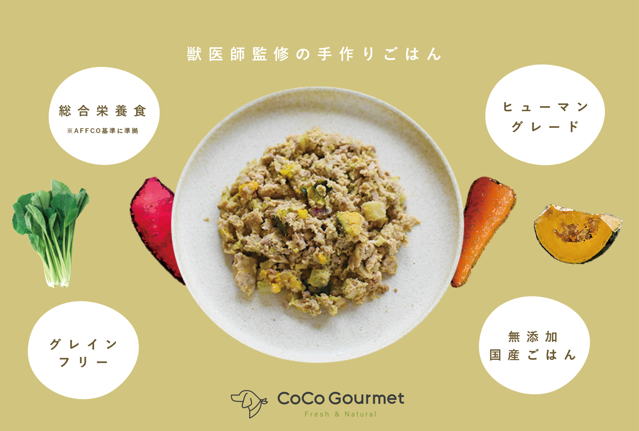 獣医師監修手作りドッグフード「ココグルメ」は、新鮮な国産のお肉と野菜を使い、学校給食など私たちの食事を作る調理工場で丁寧に低温調理・急速冷凍され作られたフレッシュフードです。安心安全なだけでなく、食材本来の味、香り、栄養素がそのまま詰まっており、ワンちゃんたちが喜ぶごはんとして販売食数650万食を売り上げています。
