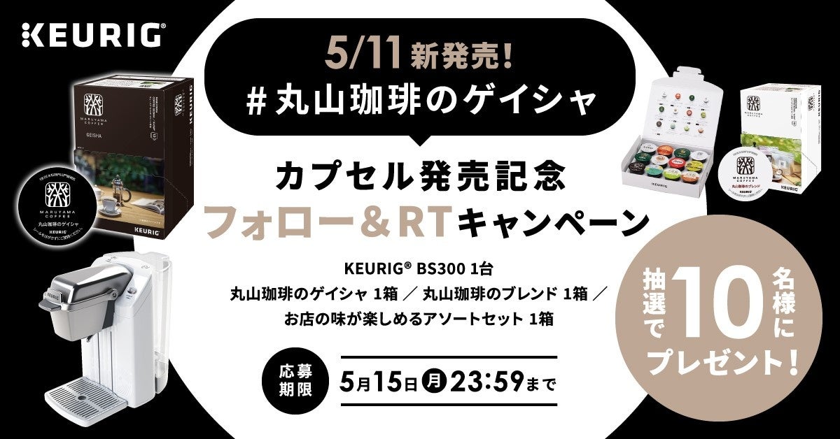 発売に合わせ、KEURIG®マシンと丸山珈琲のカプセル2商品のセットが当たるキャンペーンをTwitterにて実施いたします。丸山珈琲 (@MARUYAMA_COFFEE)とKEURIG®(@KEURIG_JAPAN)の両アカウントをフォローし、丸山珈琲アカウントのキャンペーンツイートをリツイートした方の中から10名様にプレゼントいたします。応募期間は2023年4月27日(木)~5月15日(月)となりますので、こぞってご応募ください。