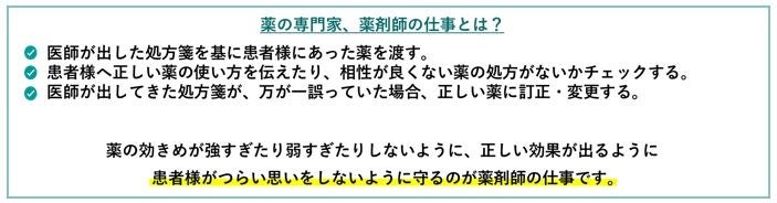 「薬剤師」は、医薬品全般に関する知識を有する「薬」の専門家です。今回の職業体験では「調剤薬局での薬剤師」にフィーチャーしました。