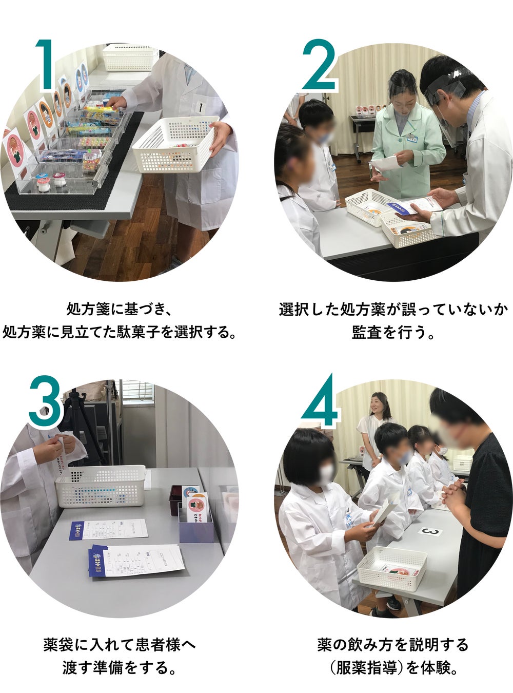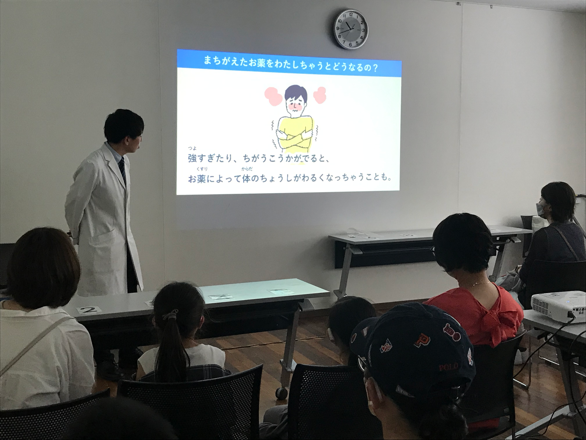 本ワークショップは、生活する上で欠かせない「病気の治療」や「健康維持」に関わる「調剤薬局での薬剤師」を体験し、「薬剤師」の仕事がなぜ重要なのかを始め、調剤薬局に対する理解を深めると共に、親子共通の夏休みの思い出作りの場にもなりました。