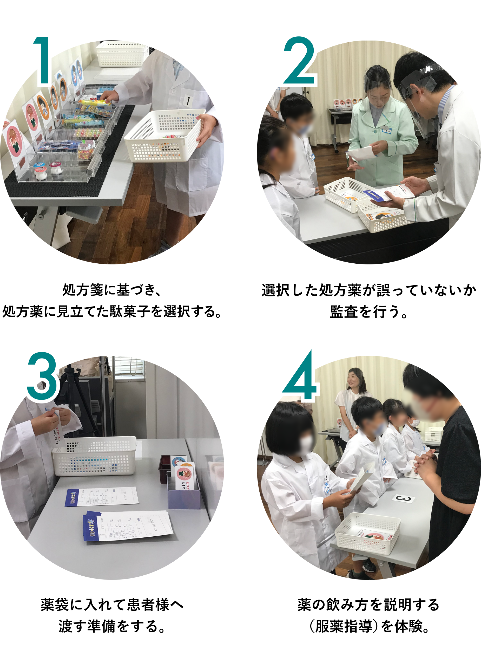 また、保護者の方々にも「患者様役」として参加いただいており、薬剤師役の我が子から薬を受け取る際に「お大事に」と言葉を掛けられ、日ごろとは異なる我が子の姿に目を細め見守られていました。