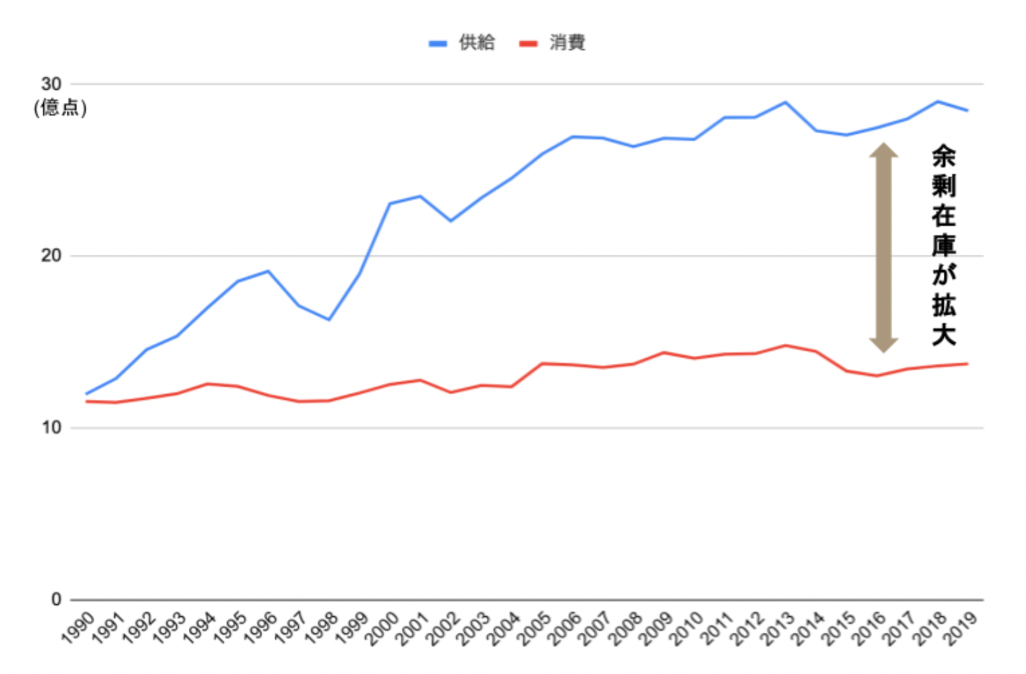 また、2018年の日本国内における衣料品供給量(下着除く)は29億点に対し、購入された数は13.5億点と、その消化率はわずか47%。購入されなかった15億点もの余剰在庫は廃棄処分され、環境への負荷が生じています。(※2)