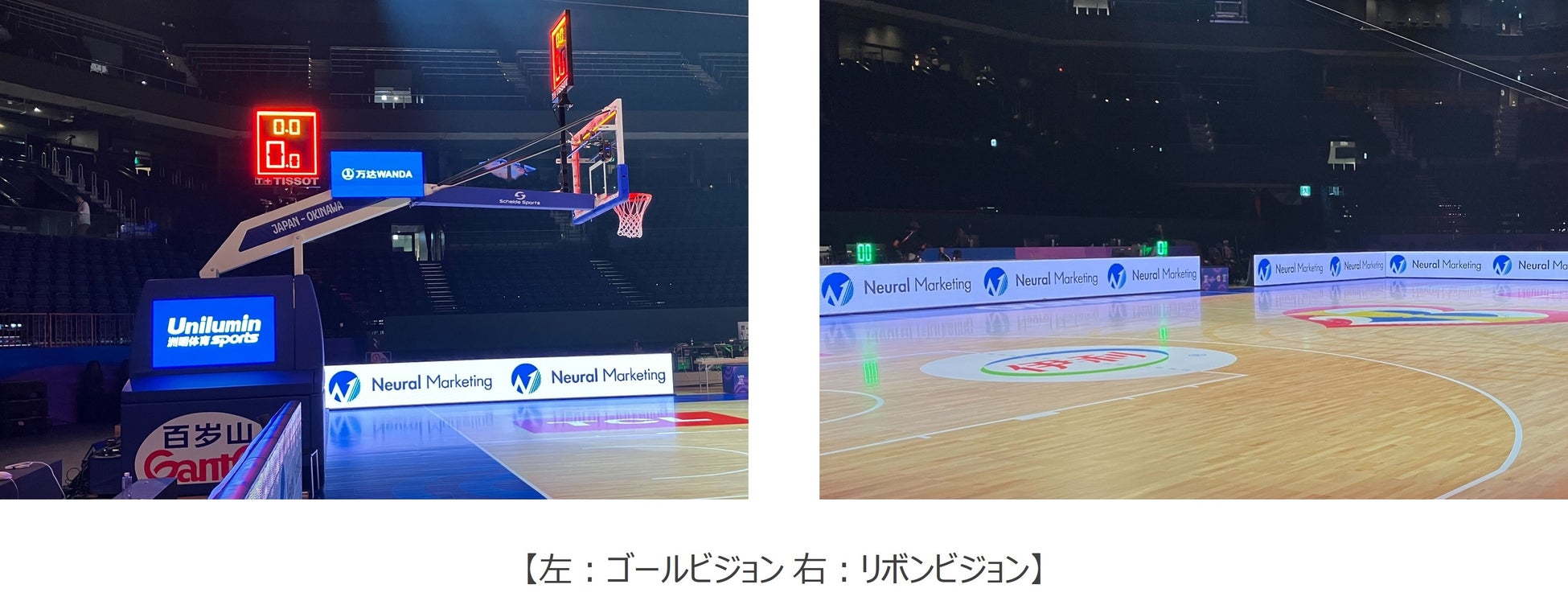 当社とユニルミングループは沖縄アリーナへ7面のリボンビジョンと4面のゴールビジョンを導入し、会場全体を巻き込んだ演出を行います。LEDビジョンを通して会場のボルテージを高めることで「FIBAバスケットボールワールドカップ2023」の更なる盛り上がりに貢献いたします。