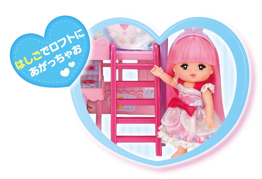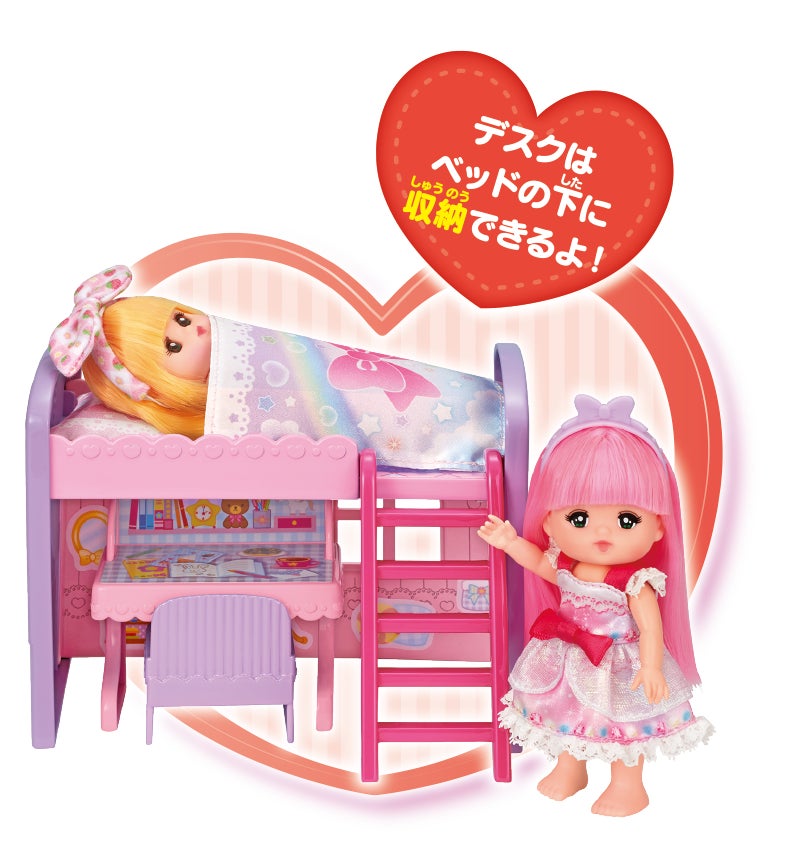 ポケットメルちゃんシリーズに「ベッド&デスクセット」が新登場。デスクに座っておべんきょうしたり、ロフトベッドでおねんね遊びができるセットです。ロフトベッドにははしごをかけて上がれます。かわいいまくらとふとんも付いています。デスクをベッドの下に収納したり、模様替えを楽しめます!ポケットメルちゃんといっしょにごっご遊びを楽しんでくださいね。