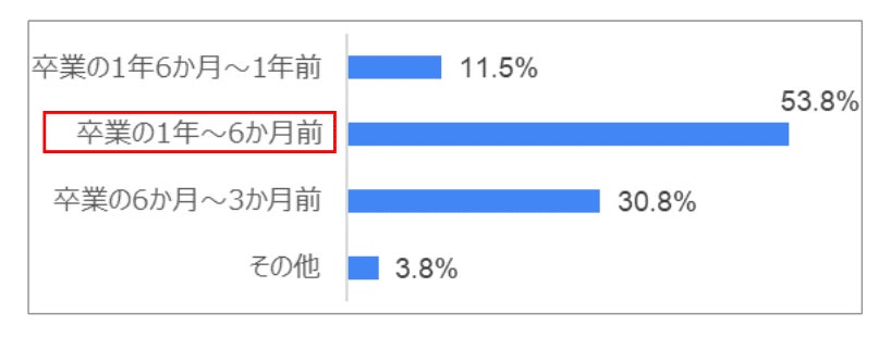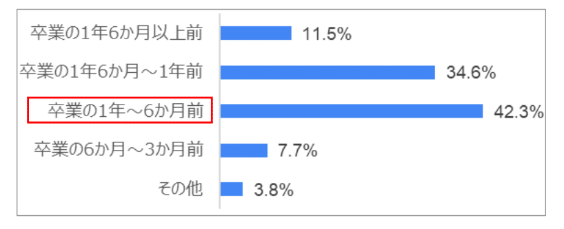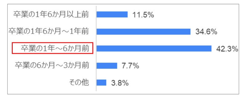 内定を獲得した外国人留学生の4割以上(42.3%)が、「卒業の1年~6か月前」に本格的に就活を開始したことがわかりました。次いで、「卒業の1年6か月~1年前」が3割以上(34.6%)でした。