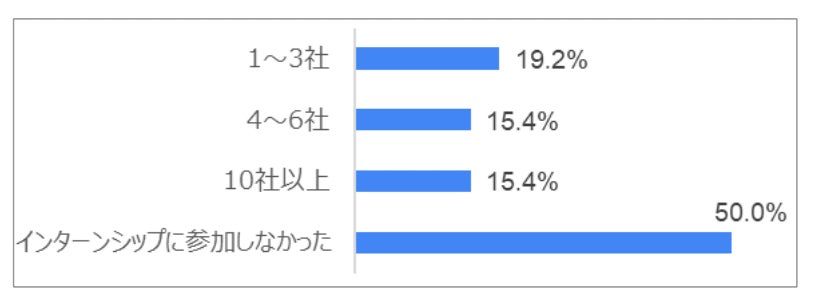 インターンシップに参加した人の参加企業数を見ると、「1~3社」(19.2%)が最多で、「4~6社」と「10社以上」が同数(15.4%)となり、4社以上受けた人が30.8%(15.4%+15.4%)だったことがわかりました。一方、参加しなかった人も半数(50.0%)でした。