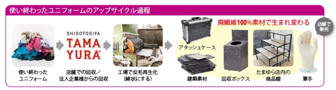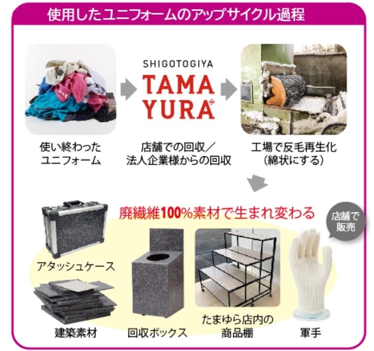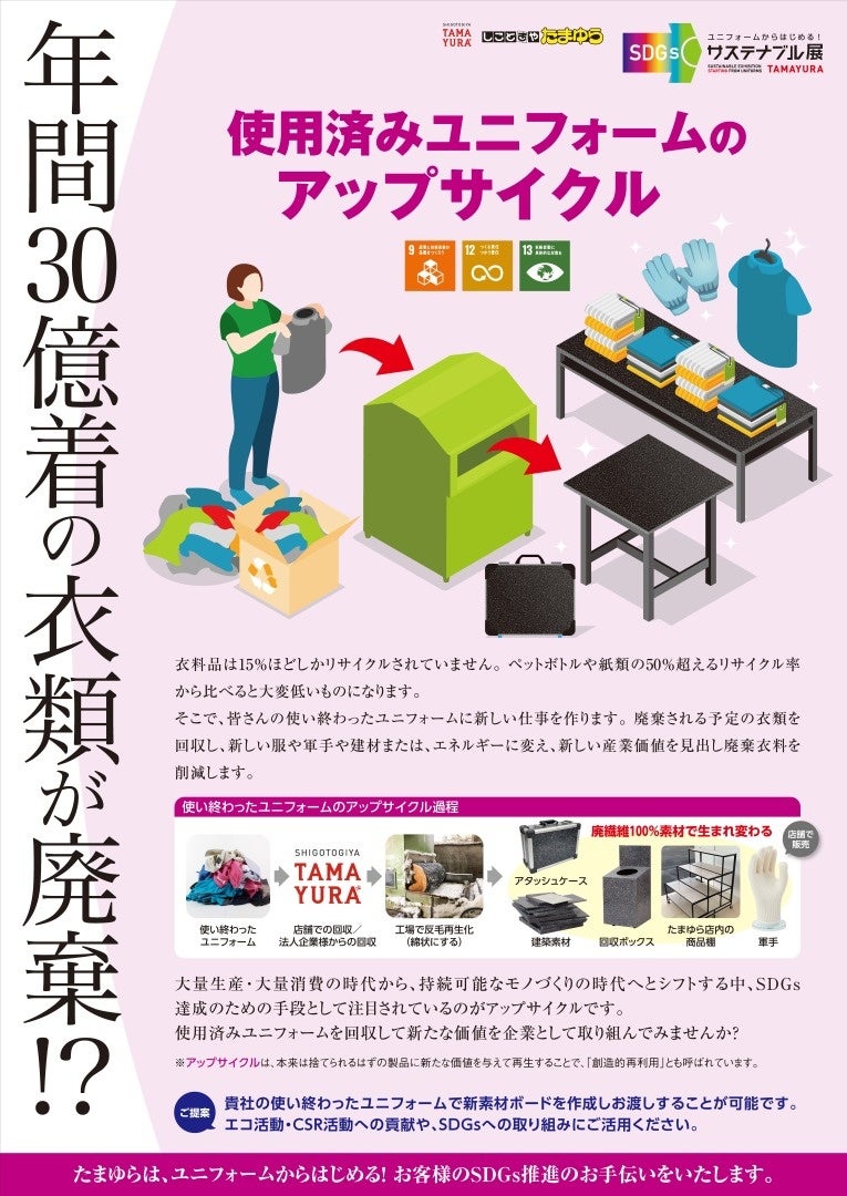 わたしたち中小企業においても、SDGsへの積極的な取り組みは必須であると感じています。今回オープンする店舗は、新たな試みとしてお客さまから不要なユニフォーム(衣類)を回収してできた、サステナブルな什器を、同店内に一部導入いたします。設置する回収ボックスもサステナブル素材になります。
