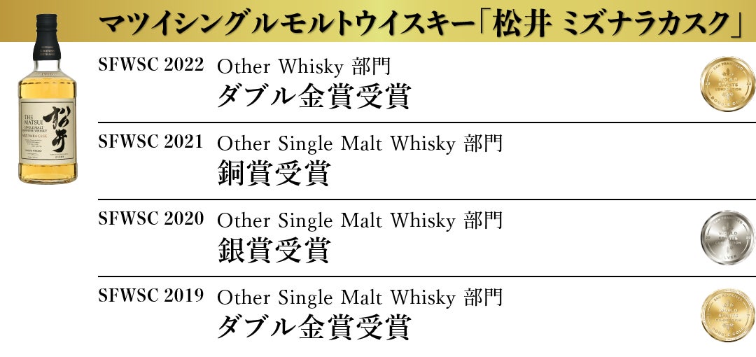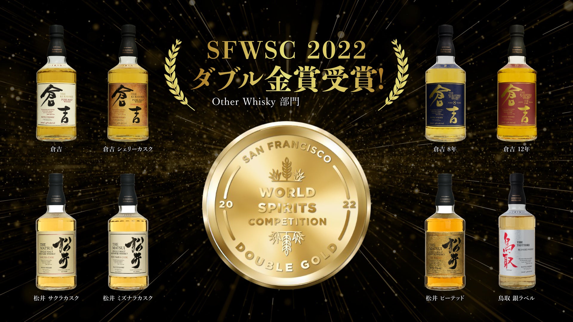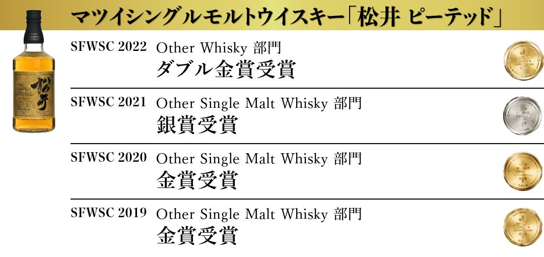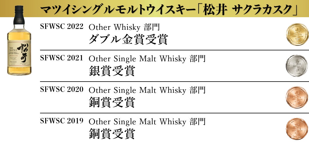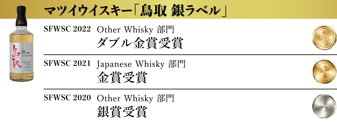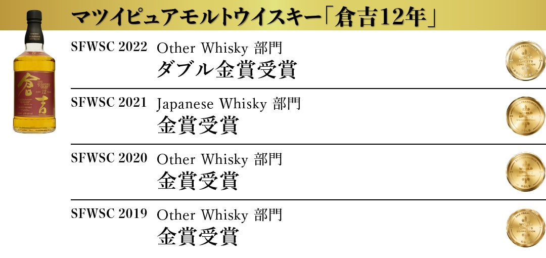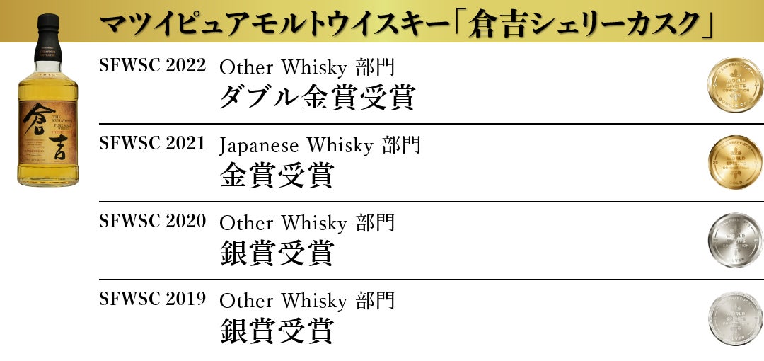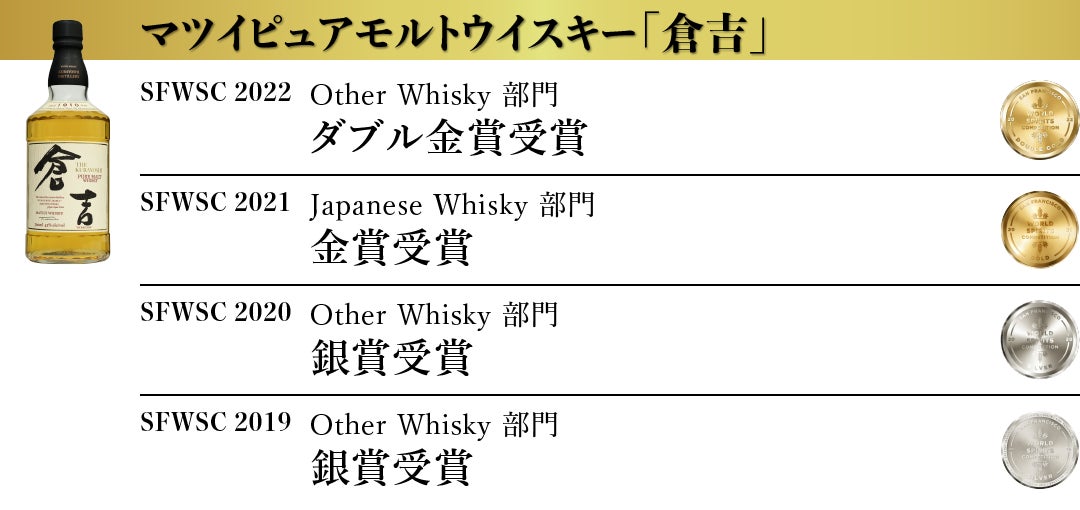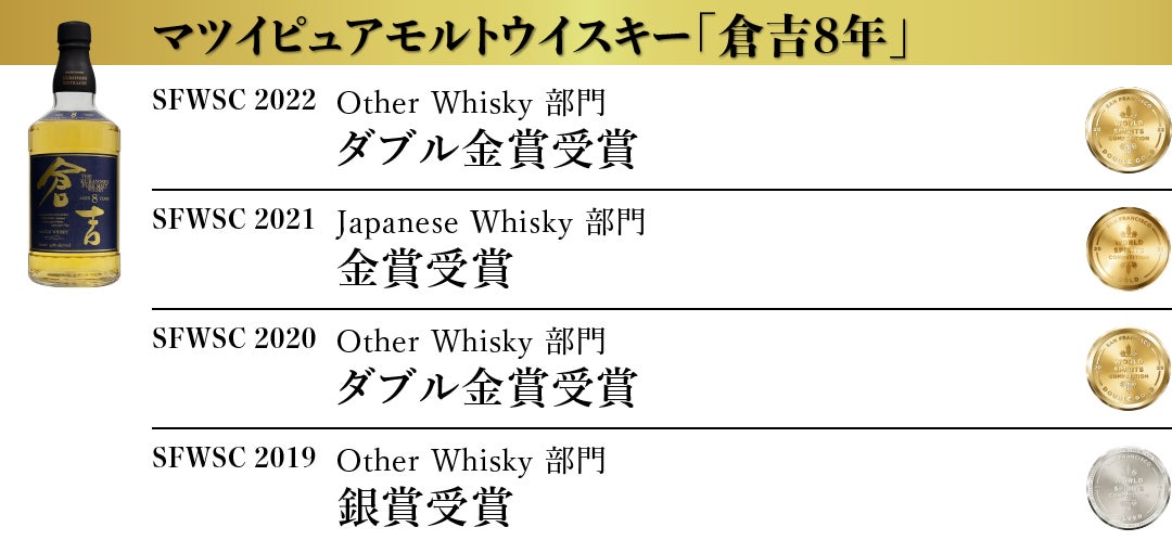 松井酒造合名会社 (以下、倉吉蒸溜所 所在地:鳥取県倉吉市)は、アメリカ最大で世界3大ウイスキー品評会のひとつである San Francisco World Spirits Competiton 2022(以下SFWSC)において『倉吉』を筆頭にマツイウイスキーの8商品が最高賞のダブル金賞を受賞いたしました。(弊社プレスリリースhttps://matsuiwhisky.com/blog/20220209/1223/)