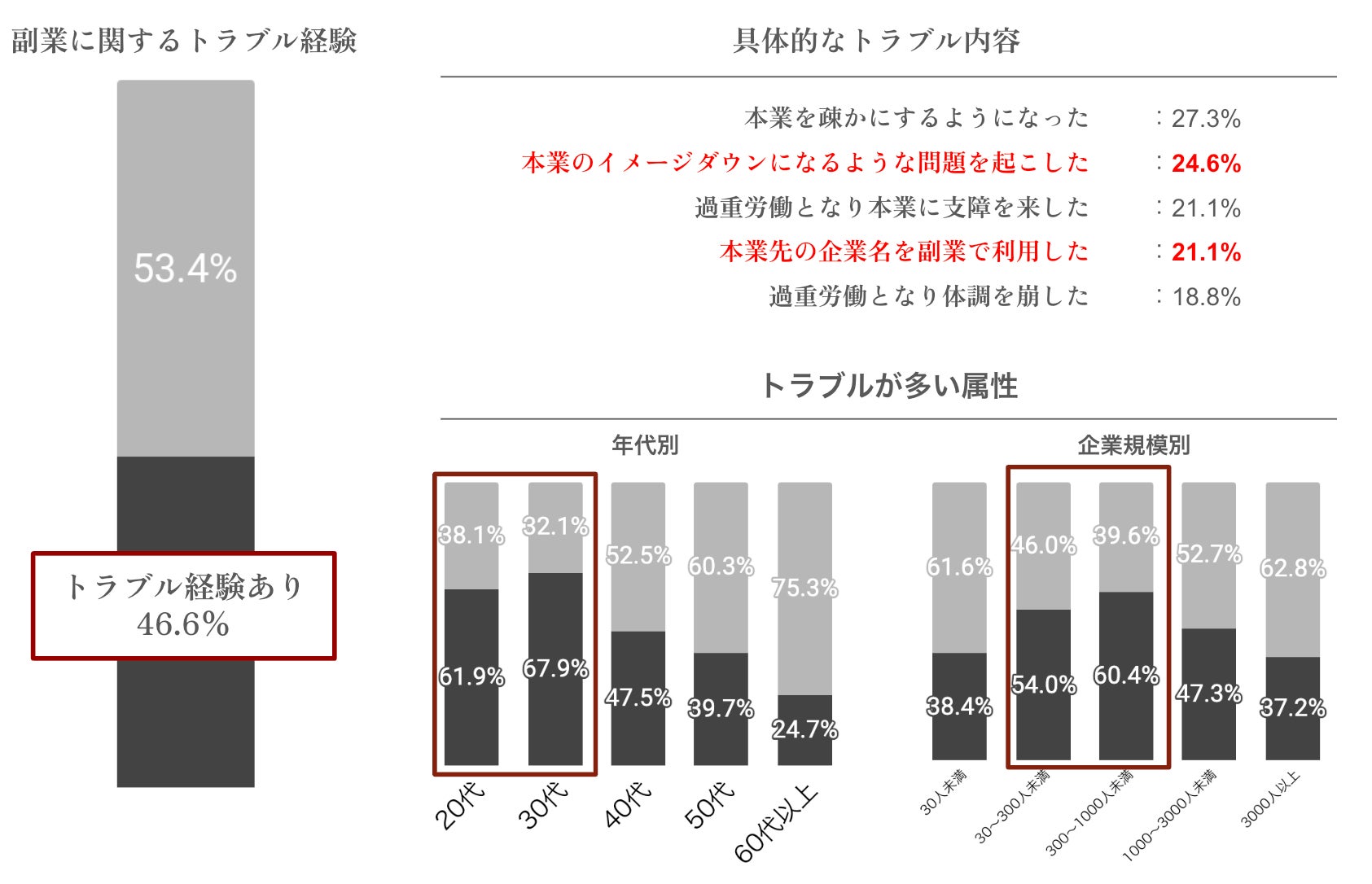 副業者の46.6%が、副業に関するトラブル経験を持っているという結果になった。年代別では20代は61.9%、30代は67.9%という高い割合でトラブル経験を持っていることがわかった。企業規模別で見ると、3000人以上の大規模でのトラブル発生率が最も低いことがわかった。