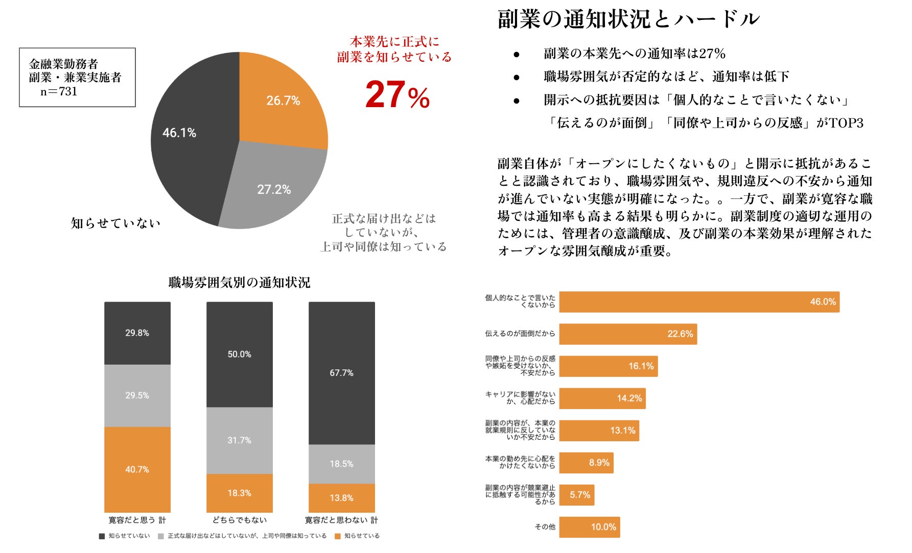■金融業界における本業先への副業通知は27%、46%は通知せず副業実施。「副業=非難されること」という空気感、相談できる環境未整備が課題