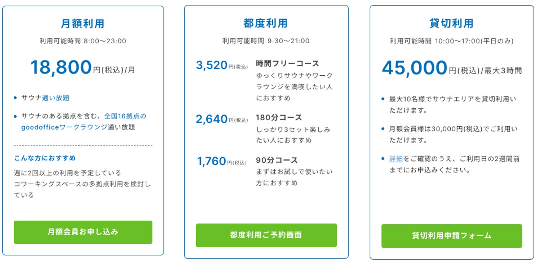 グッドサウナには、「月額利用プラン」、「都度利用プラン」、新設された「貸切プラン」の3つのご利用プランがございます。また、これまでご案内していた「都度利用プラン」は内容がリニューアルし、3つのコースから選択可能になりました。