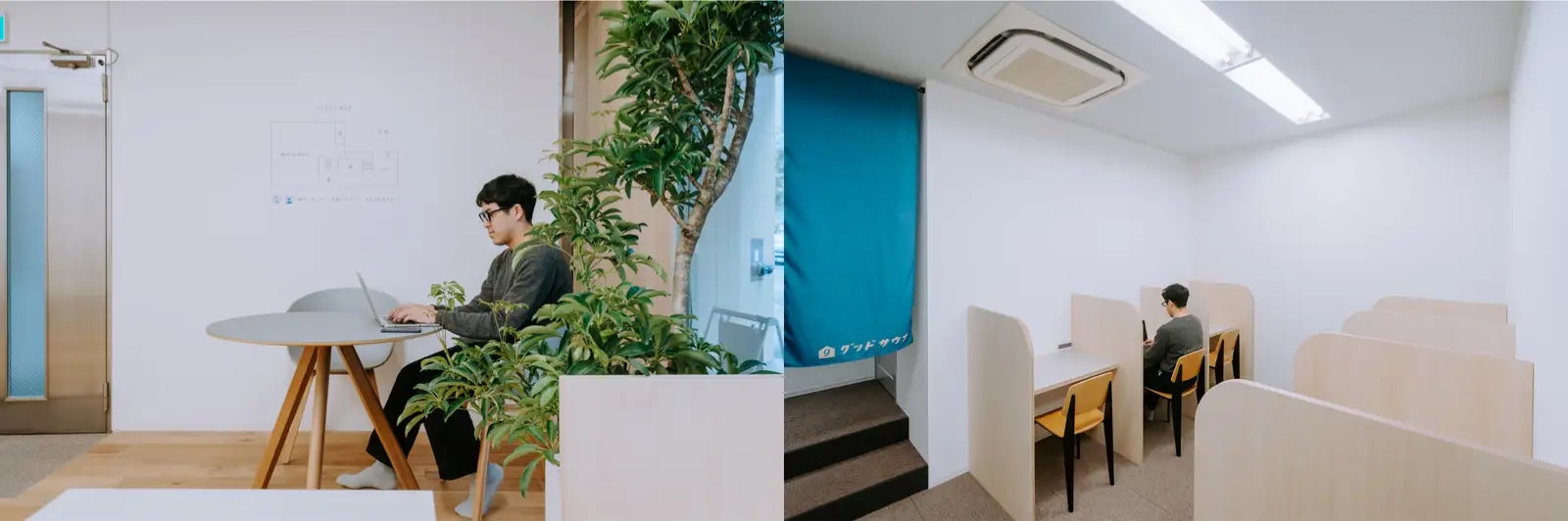 サウナやアウトプットスペースでのリラックス後は、半個室型またはオープンスペースの2タイプのラウンジで再び仕事に集中することができます。Wi-Fi・電源完備で、コーヒーとお水のドリンクサービスもご利用可能です。月額会員の方は、全国に17箇所あるgoodofficeのワークラウンジも使い放題となります。
