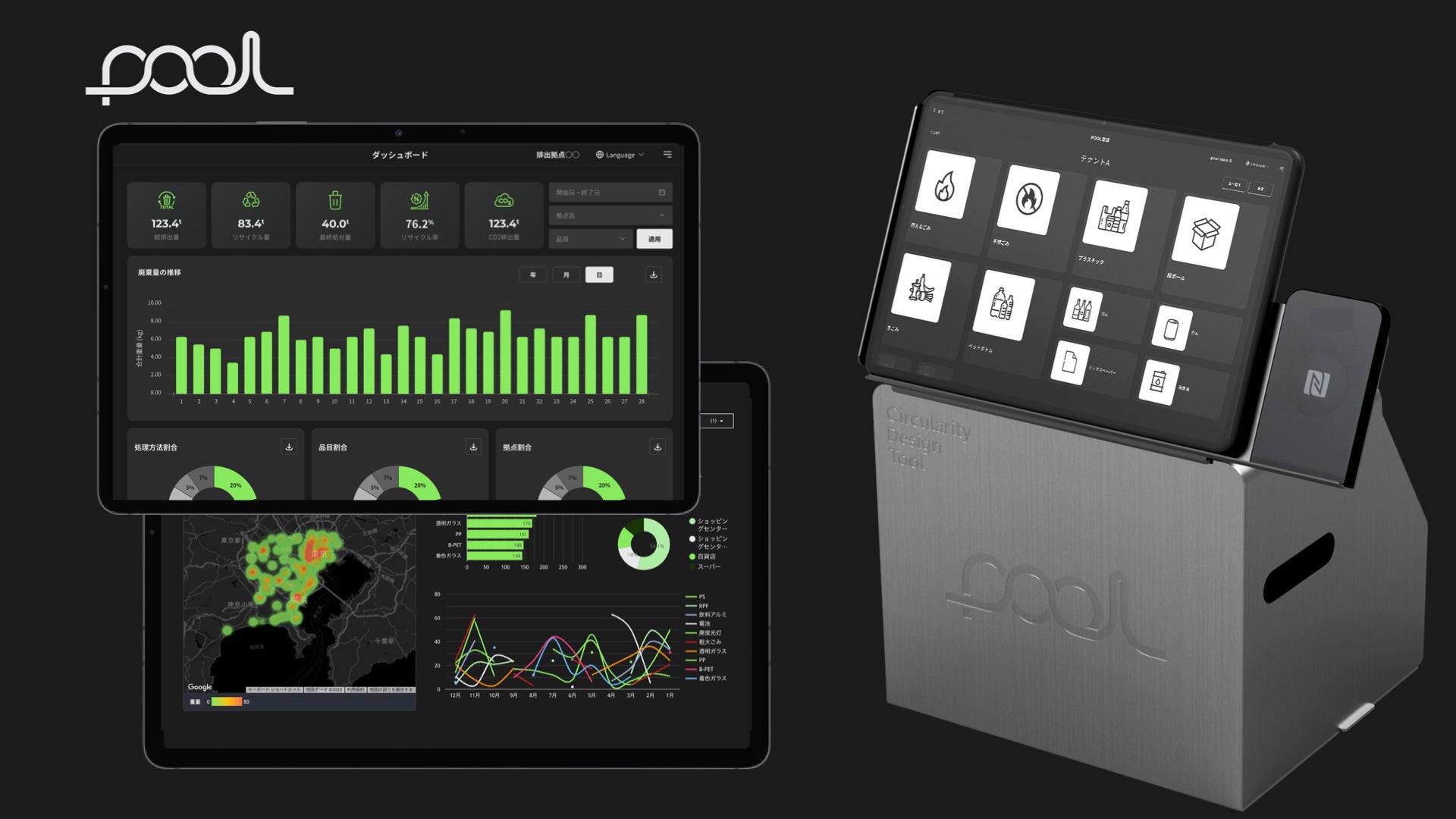 poolは、資源価値の終わりを始まりに変えるクラウドサービスです。都市資源をpoolでデータ化することによって回収効率を高め、リサイクル材料を活用したい製造業者と排出事業者を繋ぎ合わせて循環型サプライチェーンをデザインします。ごみの発生から、運搬、リサイクルのすべての過程で、スマホやタブレットで簡単に情報連携することで、リサイクル材を活用する上で欠かせない「どこから」「どのようなプロセス」を経てリサイクルしたかのトレーサビリティ情報とスコープ3カテゴリ1・5のCO2排出量情報を提供します。