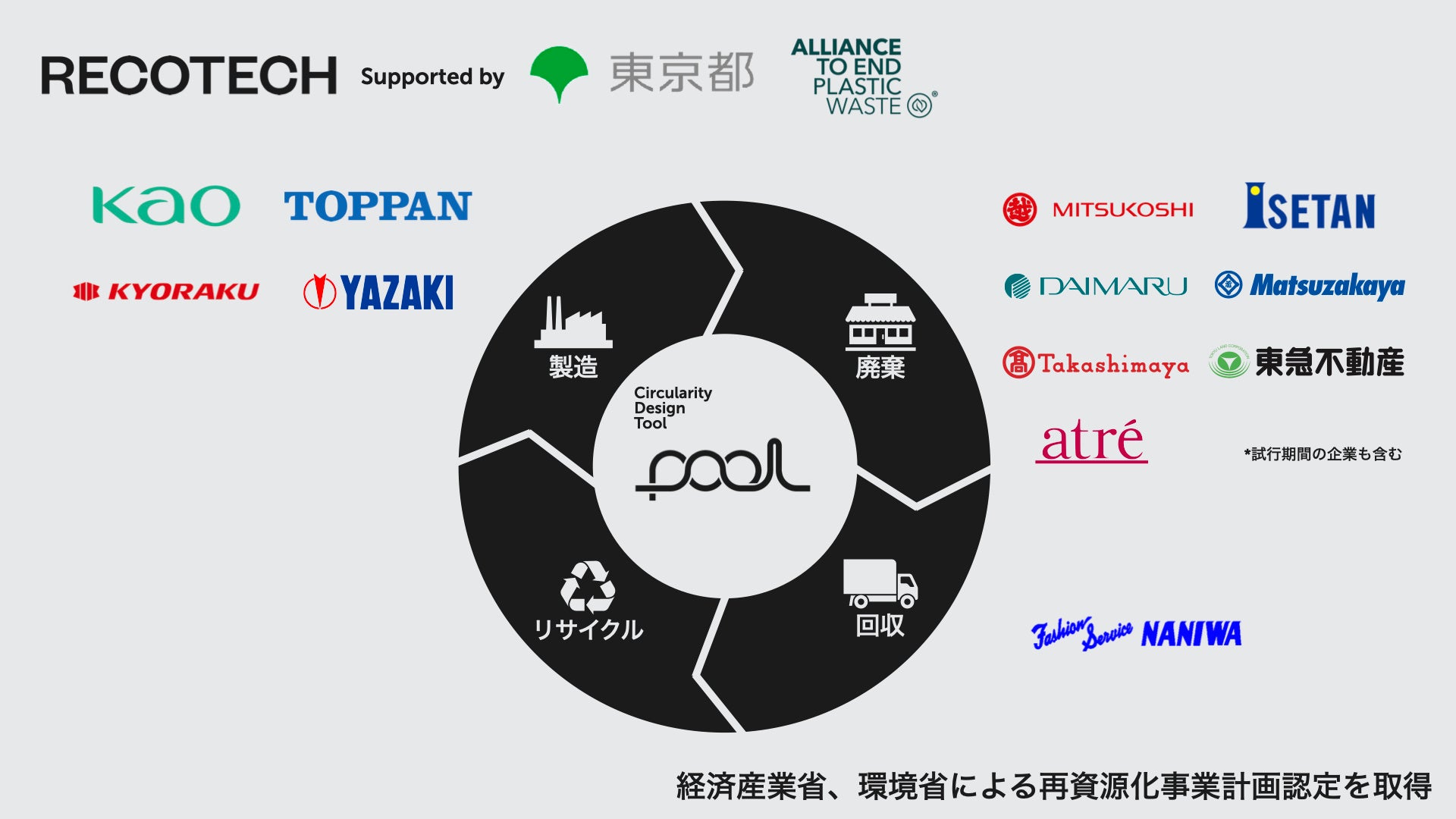 東京都は、2050年までに世界のCO2排出実質ゼロに貢献するため、令和1年12月に「ゼロエミッション東京戦略」を策定・公表しています。その中で、使い捨てプラスチックの大幅なリデュース・リユースや、バージン資源と同等の樹脂に戻す水平リサイクルの実装化を推進するため、令和3年度より革新的技術・ビジネスモデルの社会実装を目指す事業者と共同で事業を行っています。レコテックは令和3年度の「調査・分析事業」と「実証事業」に採択され、継続してpool事業を進めてきました。