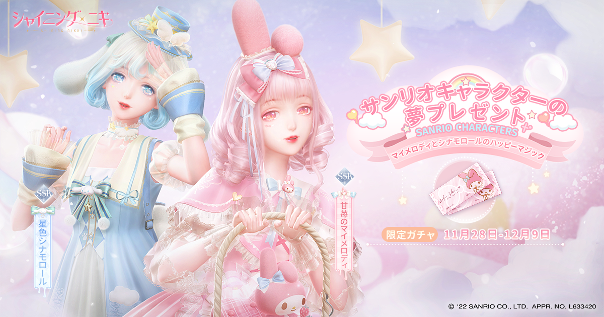 Papergames(ニキ株式会社)は、全世界でシリーズ累計1億DLを突破した大人気着せ替えゲーム『シャイニングニキ』において、2022年11月28日(月)より株式会社サンリオのキャラクターとのコラボイベント「サンリオキャラクターの夢プレゼント」を開催したことをお知らせいたします。本イベントでは大人気キャラクター シナモロール、マイメロディをイメージした限定コーデを獲得することができます。またコラボを記念してTwitterキャンペーンも開催中です。ぜひご参加ください。