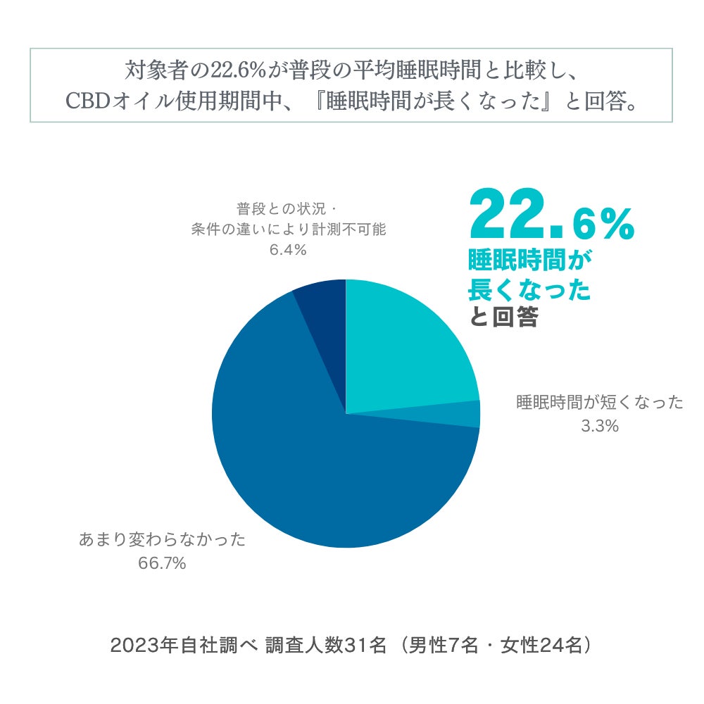 普段の平均睡眠時間と比較し、CBDオイル使用期間中、『睡眠時間が長くなった』と回答した対象者は22.6%でした