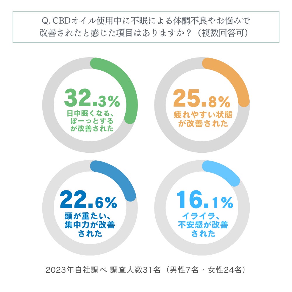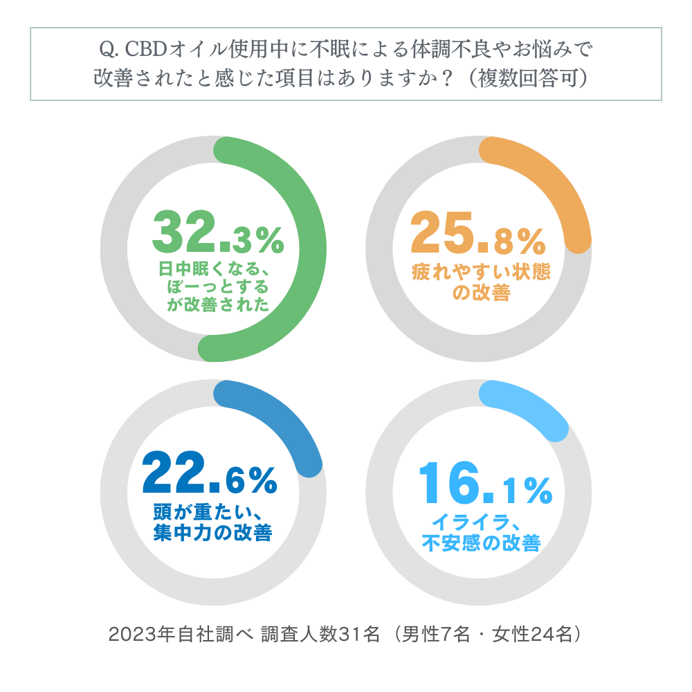 以上の項目の他に、不眠による体調不良や悩みの改善について、CBD10%含有オイルを使用した対象者の