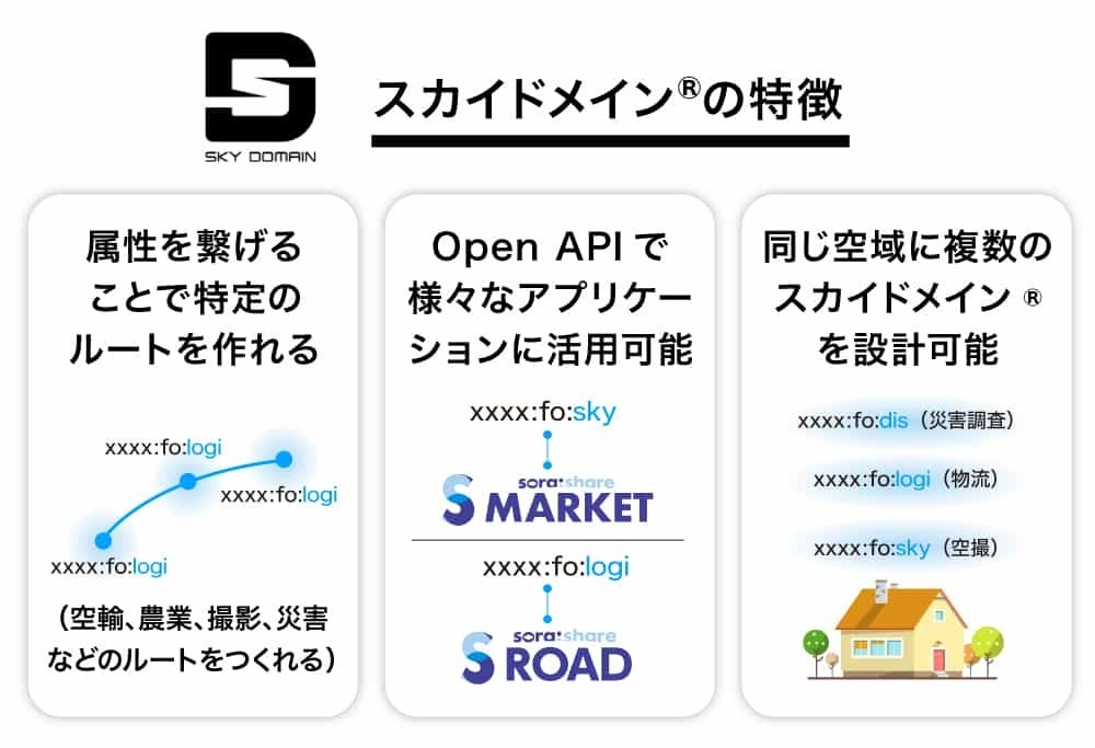 弊社の運営する「ソラシェア( https://www.sorashare.com/ )」は、上空をドローンが⾶ぶことによる不安を解消し、ドローン⾶⾏の合意が取れている空域を可視化することで、ドローンの円滑な航⾏を可能にすることを⽬指します。さらに、合意が取れた空域をつなげて「空の道」を作ることで、第三者上空の⾶⾏を必要とするドローン利活⽤(物流やセキュリティ等)を促進します。「ドローンの社会受容性」の獲得という新しいブルーオーシャン市場を創出し、世界中の空の産業⾰命を、平和的に実現する環境を作ることが我々のビジョンです。