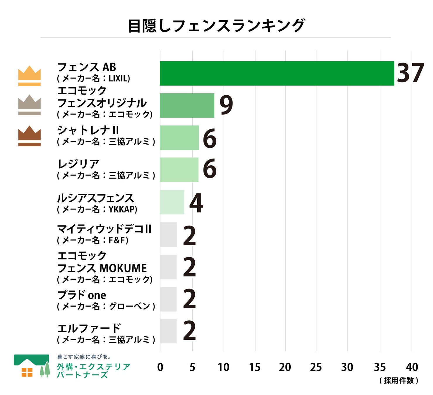 最も多く採用された商品はLIXILの「フェンスAB」で37件、次いで同じくLIXILの「ハイグリットフェンス」が32件となりました。特にフェンスABはシンプルながら高い目隠し性能を備えており、デザインと機能のバランスが支持を集めています。また、三協アルミの「ユメッシュフェンスE型」(21件)やエコモックの「オリジナルフェンス」(9件)なども一定の採用実績が見られ、多様なニーズに応える製品が評価されている様子がうかがえます。
