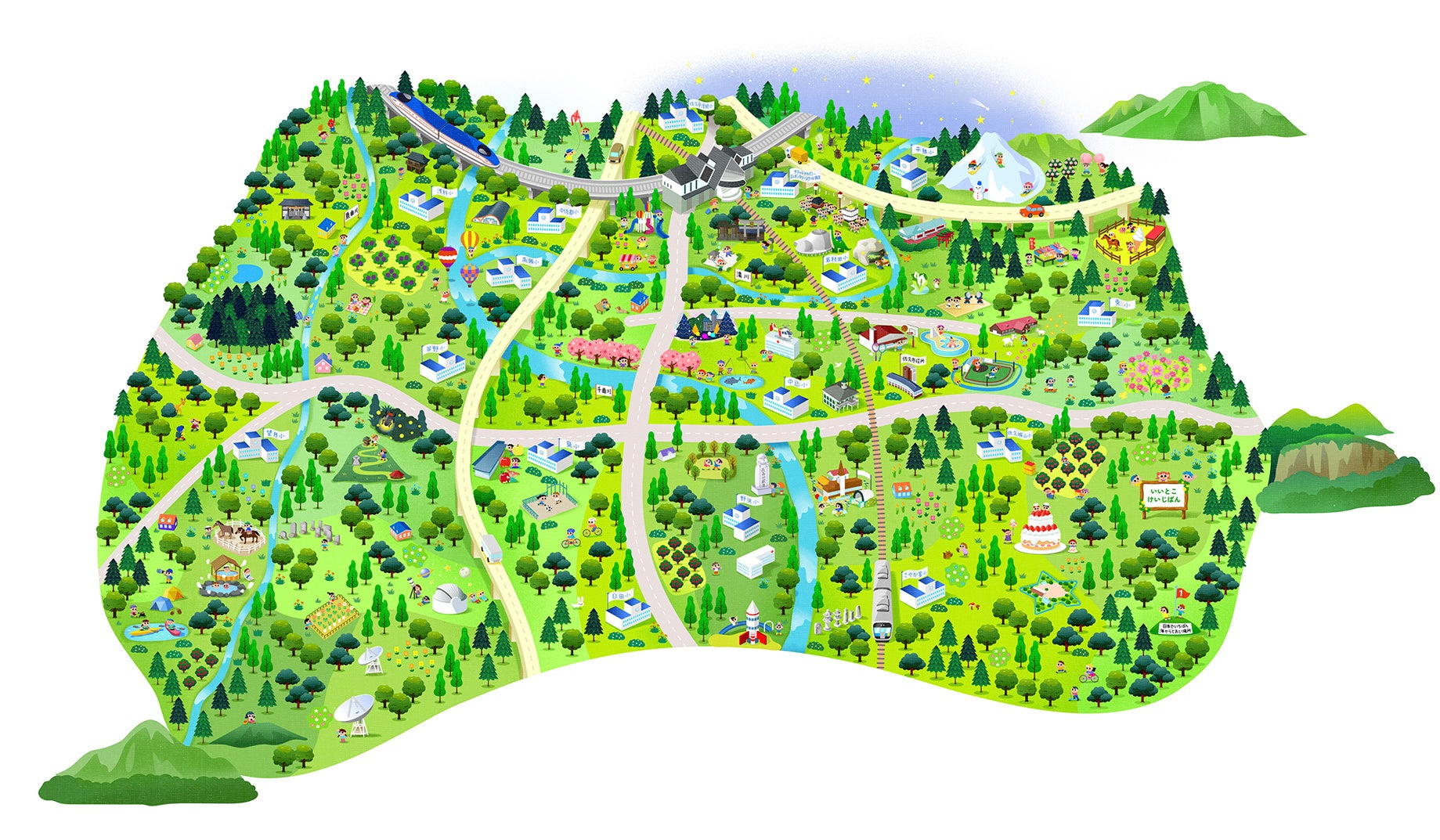 佐久市のこども達から、ご応募をいただいた1171件の情報をまとめ、64箇所の“いいとこ”として、1枚の大きなマップのイラストに落とし込みました。“いいとこ”をクリックすると、こども達から集まった実際のコメントを読むことができます。