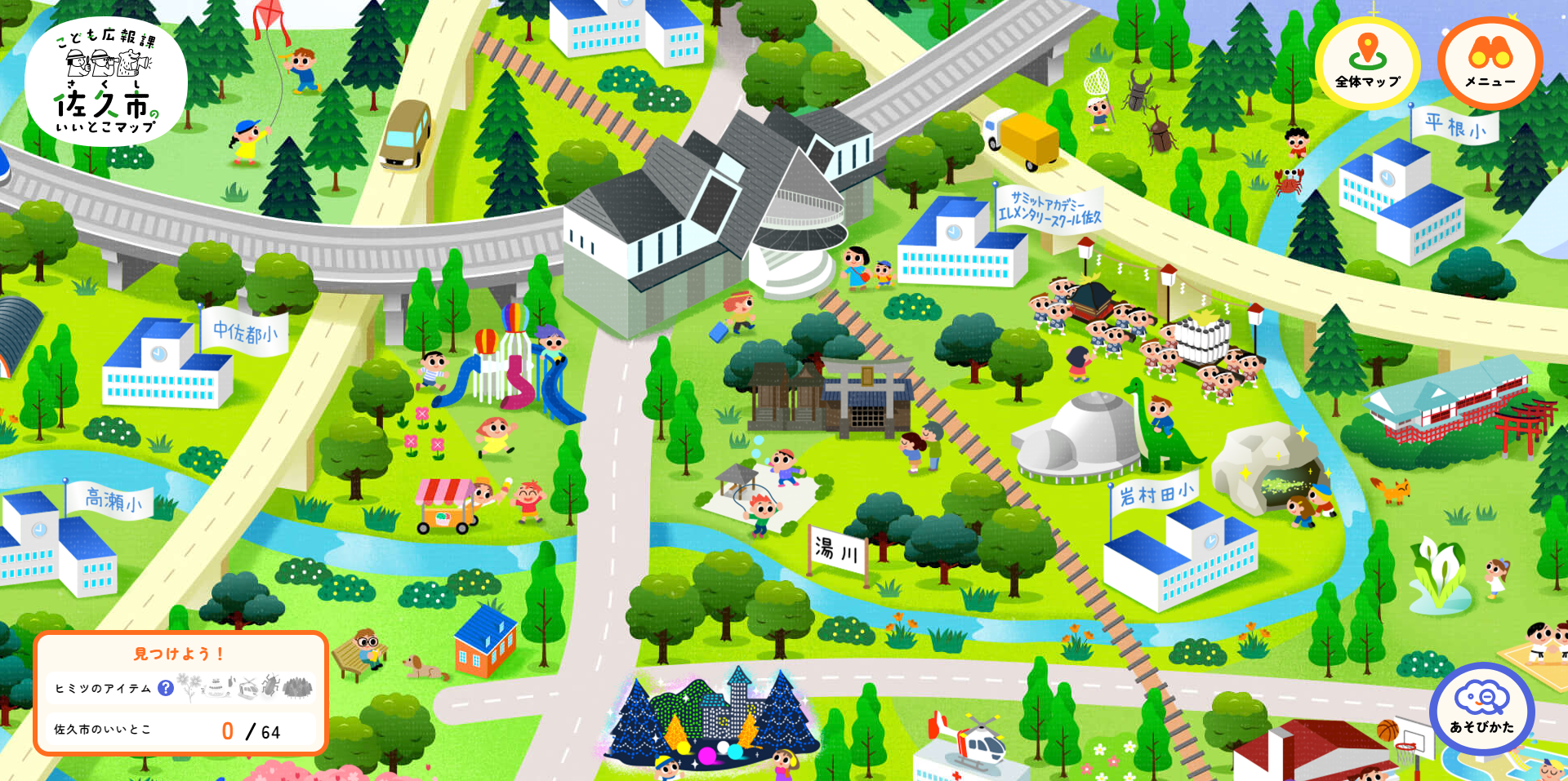 まるで佐久市内を歩いて探索するように、マップを手元で操作しながら市内の情報を集めることができます。またマップの中には、佐久市にゆかりのある「ヒミツのアイテム」が5個隠されており、“いいとこ”を調べながら「ヒミツのアイテム」をすべて集めることで、自分の名前入りの「佐久市いいとこ博士認定証」を発行することができます。お子様とご一緒に、ミニゲームを楽しみながら、本ウェブサイトを地域の情報収集にご活用ください。
