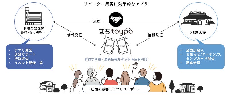 トイポの提供するアプリを活用した集客サービス「toypo」を、地域の中小企業や小規模店舗に合わせてカスタマイズし、地域金融機関が店舗を取りまとめることで店舗間の相乗効果や利用促進を可能にしたサービスです。
