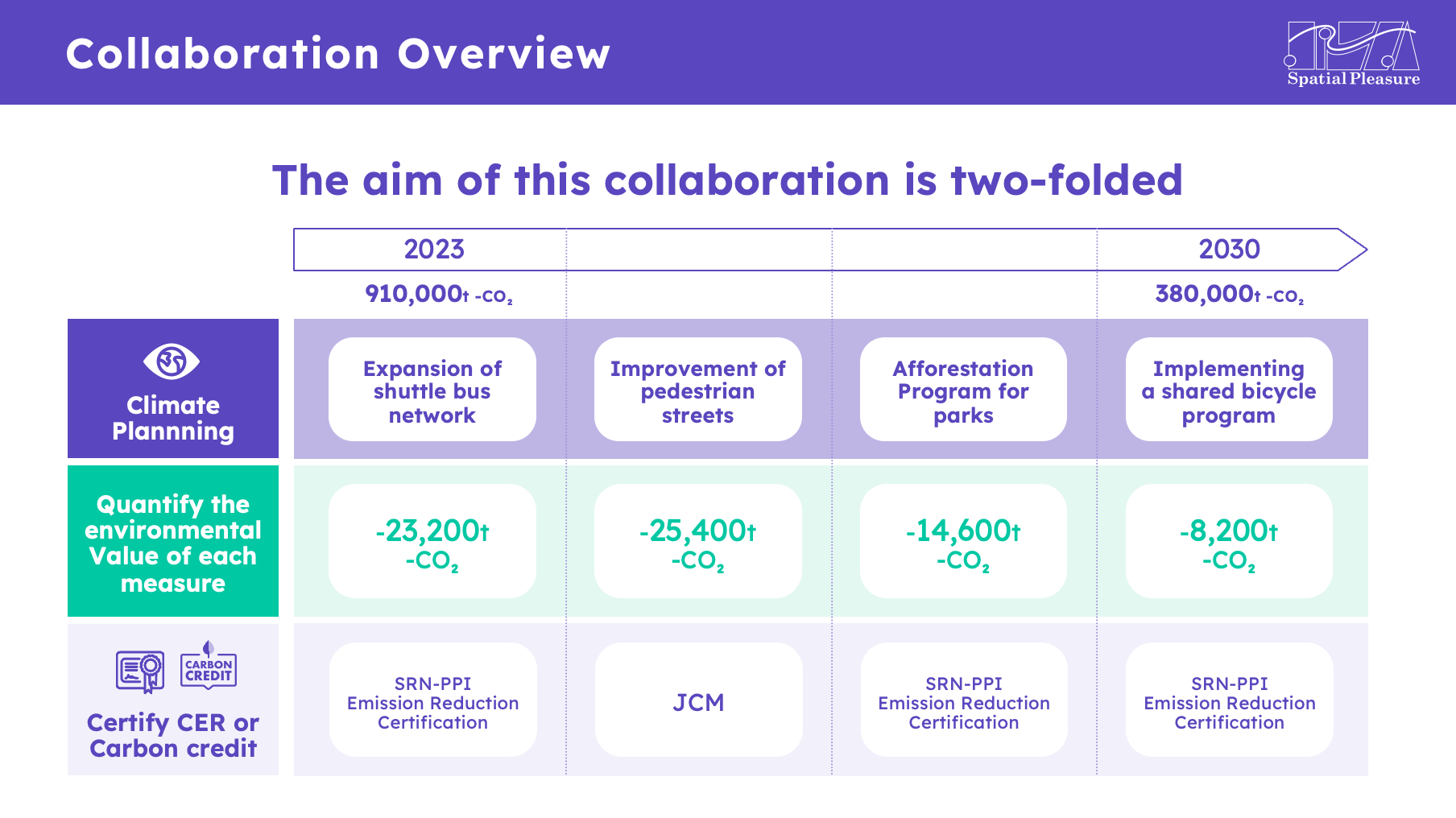 Spatial Pleasureは、交通領域におけるカーボンクレジット認証DMRVソフトウェアを開発しているスタートアップ企業。Digital GarageやDEEPCORE(ソフトバンクのAI部門)などのベンチャーキャピタルが出資。同社はインドネシアでの事業拡大に力を入れており、2023年5月にはジャカルタ・スマートシティと覚書を締結している。