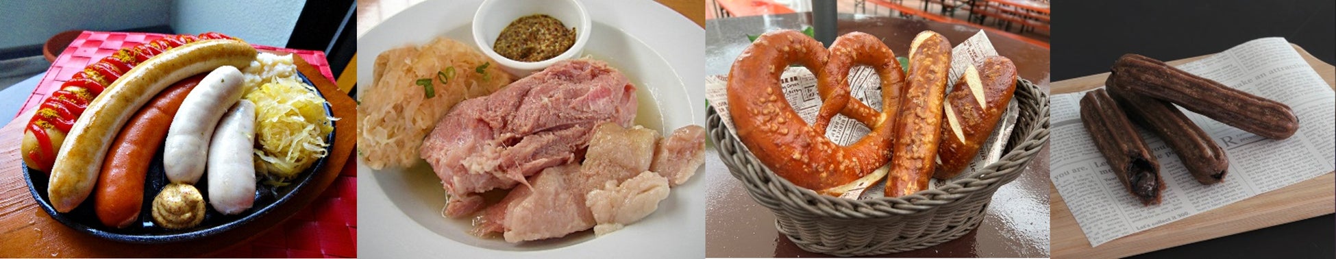 左からソーセージ盛り合わせ、アイスバイン、プレッツェル、チュロピー