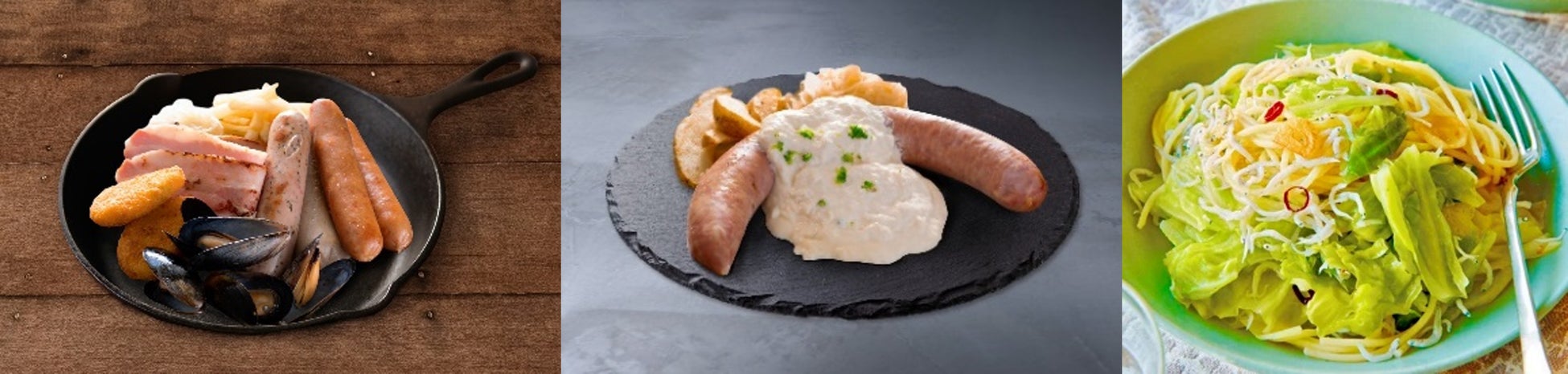 左から20thカーメリテンプレート、ビックフランクチーズフォンデュ、春キャベツのペペロンチーノ