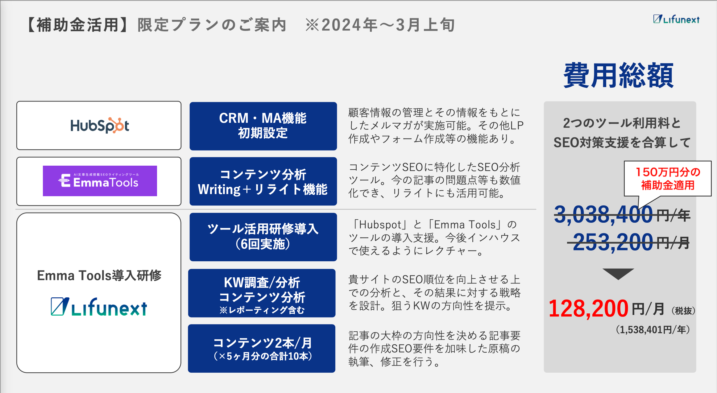 CRM・MAツールは顧客情報の管理とその情報をもとにしたメルマガの実施や、その他 LP作成、フォーム作成等の機能を実装している「Hubspot」を活用し、コンテンツ分析ツールは、コンテンツSEOに特化したSEO分析ツールの「Emma Tools」を活用します。本サービスでは、上記2つのツールの導入支援を行い、その後貴社サイトのSEO順位を向上させる戦略の設計、記事コンテンツの執筆を2本/月させていただきます。詳細は以下添付画像の通りです。