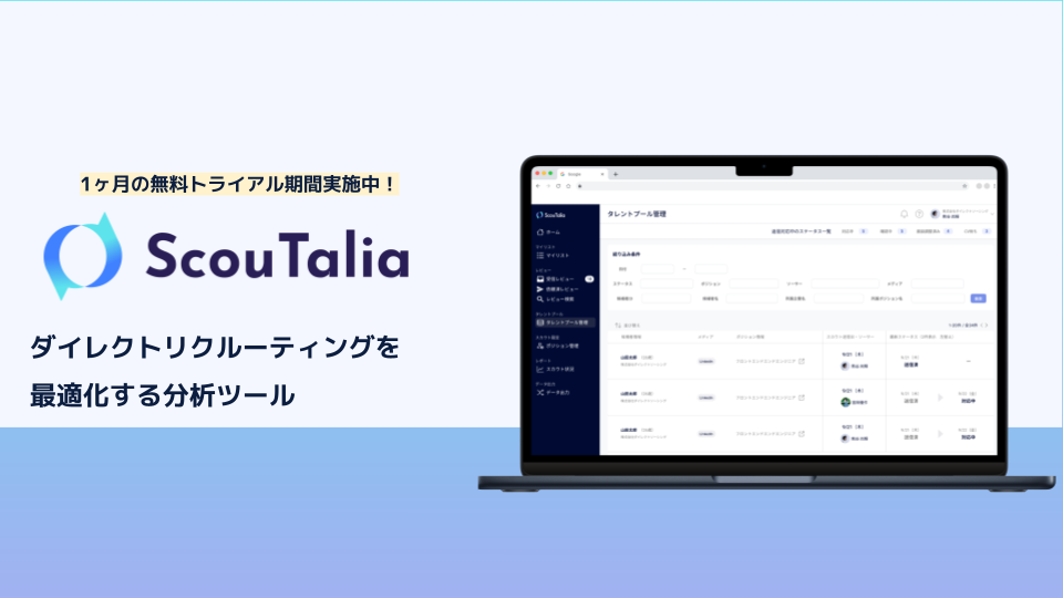 ダイレクトリクルーティングを最適化する分析ツールScouTalia(スカウタリア)を3月4日にリリース。1ヶ月の無料トライアル期間でお試しも可能。
