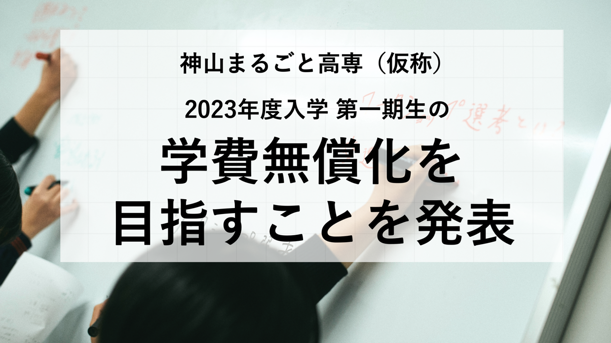 2023年4月開校を目指す私立高等専門学校「神山まるごと高専(仮称・認可申請中)」は、2023年4月に入学予定である一期生の学費無償化を目指すことを発表します。具体的には、給付型の奨学金の立ち上げを目指してまいります。