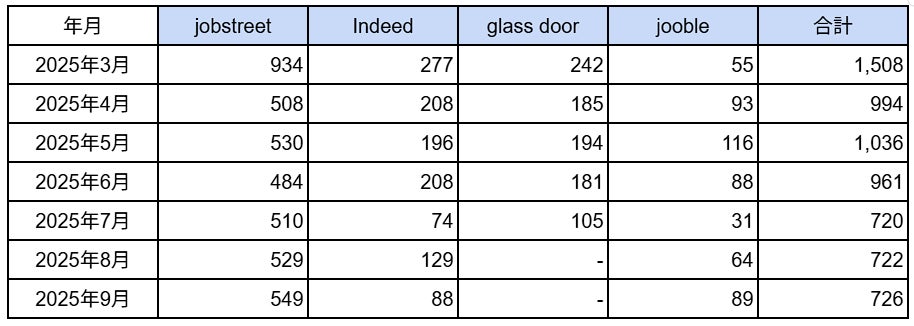 主要4サイト別の掲載数としては、「jobstreet」が549件、「Indeed」が88件、「jooble」が89件となり、複数の求人サイトで726件の求人募集となりました。