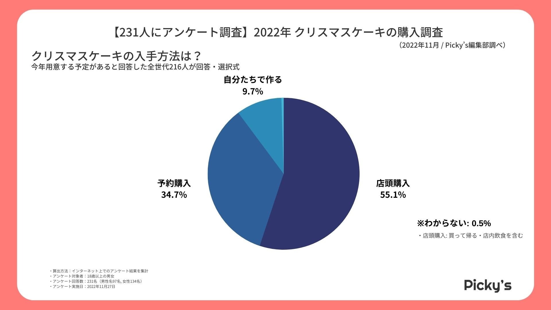 店頭購入が最も多く55.1%、次に予約購入が34.7%で続きました。また、自分たちで作るという回答も9.7%となりました。量販店などではクリスマスケーキの予約購入の広告を多く見かけますが、今回の調査においては予約購入の割合は高くありませんでした。
