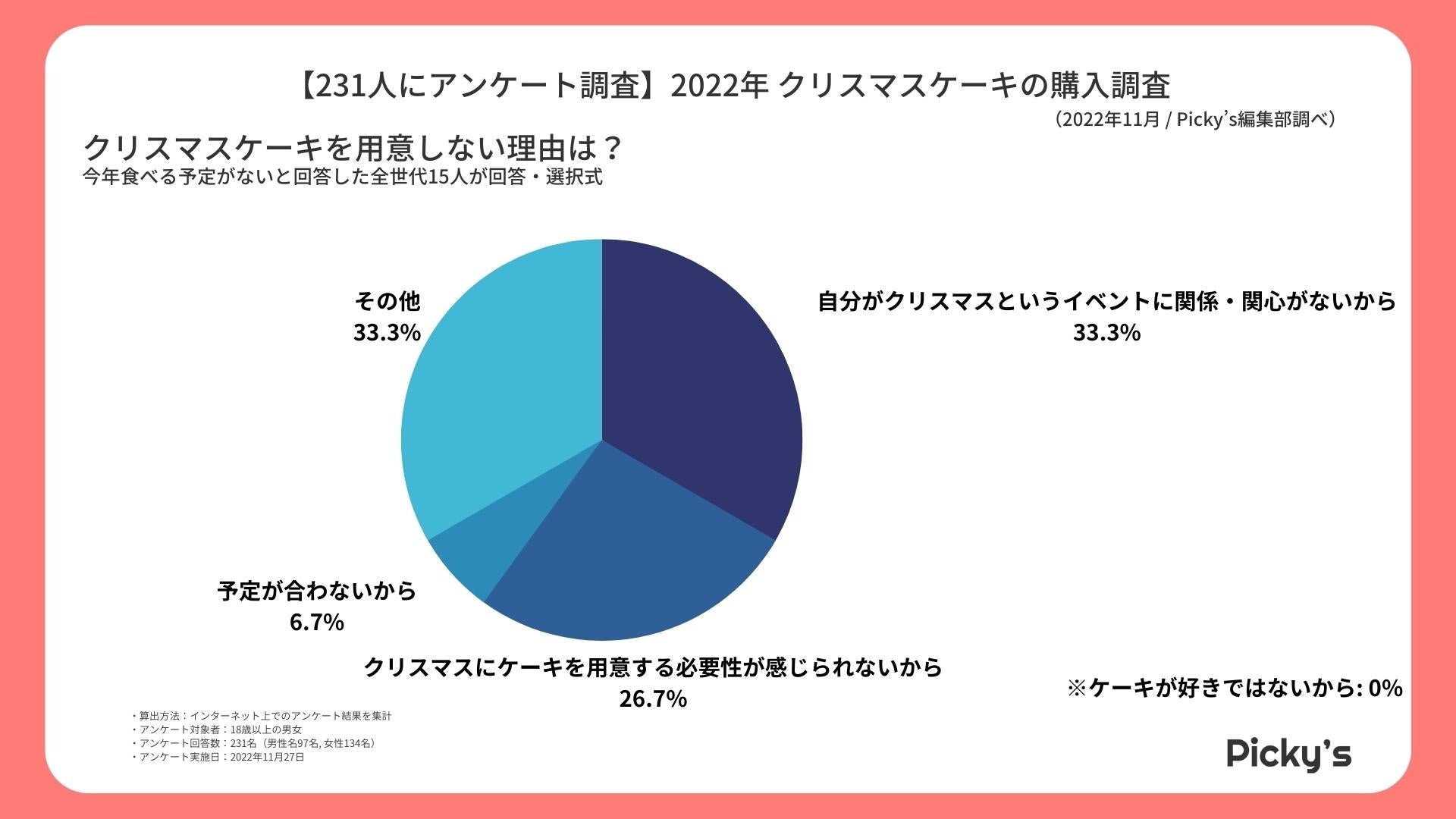 などが挙げられた一方で、「ケーキが好きではないから」の選択肢を選択した人は今回のアンケートでは見られませんでした。また、食べないと答えた人の中で「クリスマス以外にケーキを用意することがある」と答えた人は46.7%であり、母数が少ないため統計的信憑性は担保できないものの、クリスマスがキリスト教に関するイベントであることなども多少の影響がありそうです。