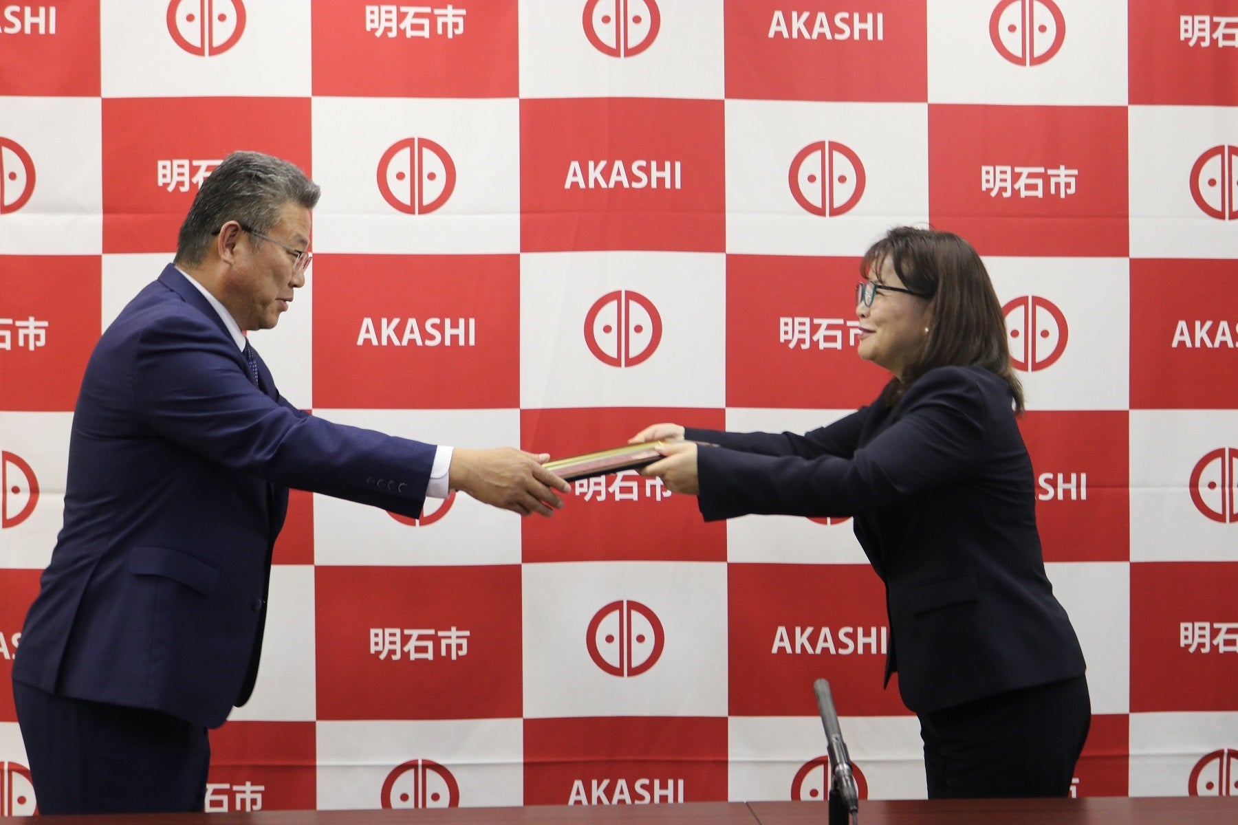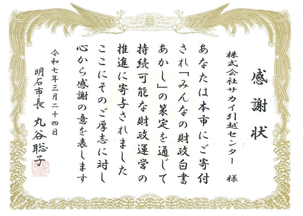 株式会社サカイ引越センター(大阪府堺市:代表取締役社長 田島 哲康)は、明石市の財政白書策定事業に対して企業版ふるさと納税に係る寄附を行い、それに対する感謝状をいただきました。2025年3月24日、感謝状贈呈式が明石市役所で行われ、兵庫県明石市 丸谷 聡子市長、サカイ引越センターからは田島通利専務取締役が出席いたしました。