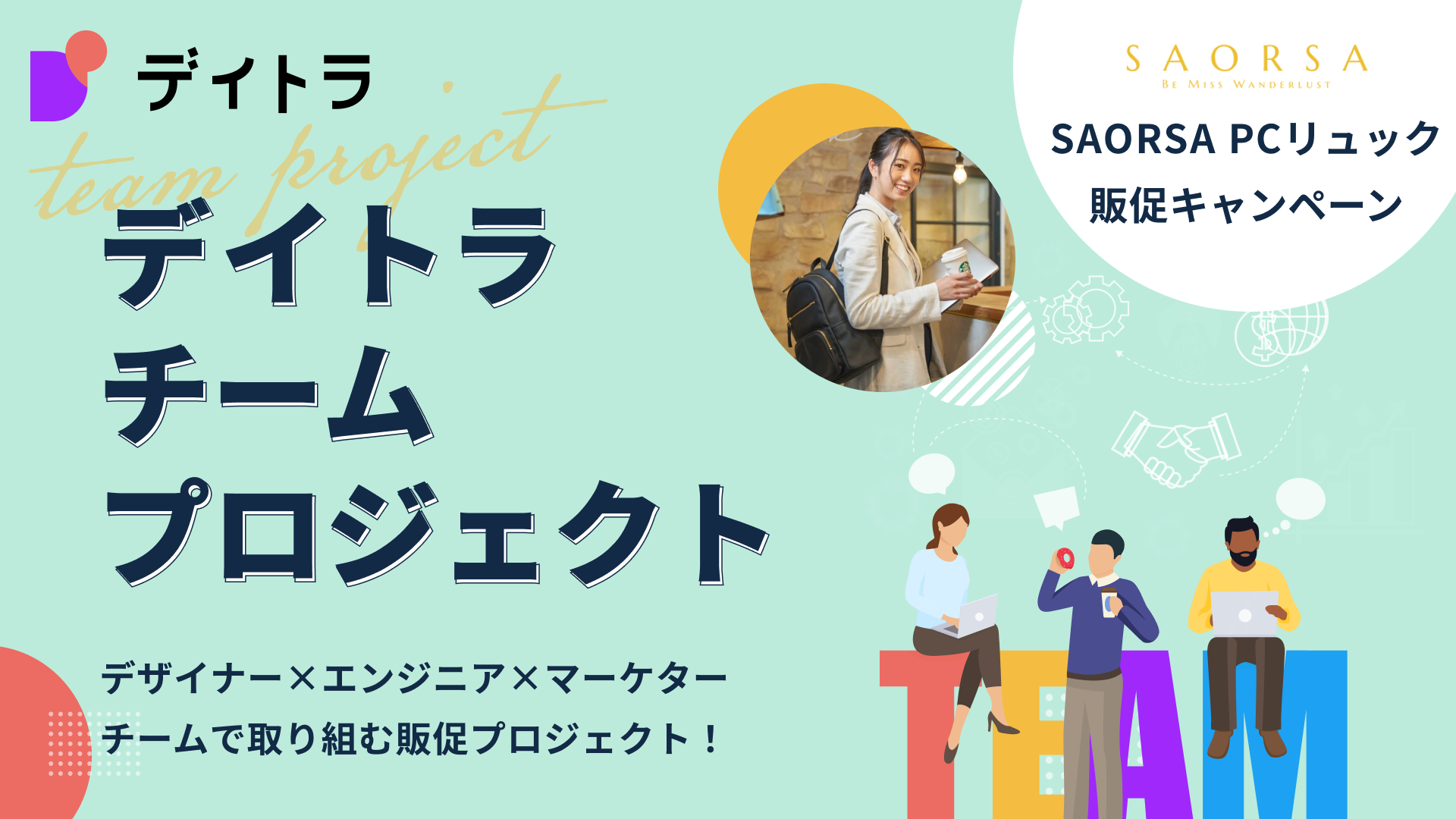 本プロジェクトは、デザインコース・Shopifyコース・マーケティングコースから各1名選出し、ある案件のランディングページ(以下、LP)デザイン・コーディング・販促をその3名のチームに発注します。LPデザインの作成を行うデザイナーだけでなく、ShopifyにLPを実装するコーダー、そして広告運用を行うマーケターまで含めて募集を行います。募集商材は当社のD2Cブランド“SAORSA“のPCリュックです。プロジェクト第一弾として、デイトラのデザインコース受講生を対象に、LPのデザインコンペを開催します。コーダー・マーケターの募集方法については追って告知予定です。