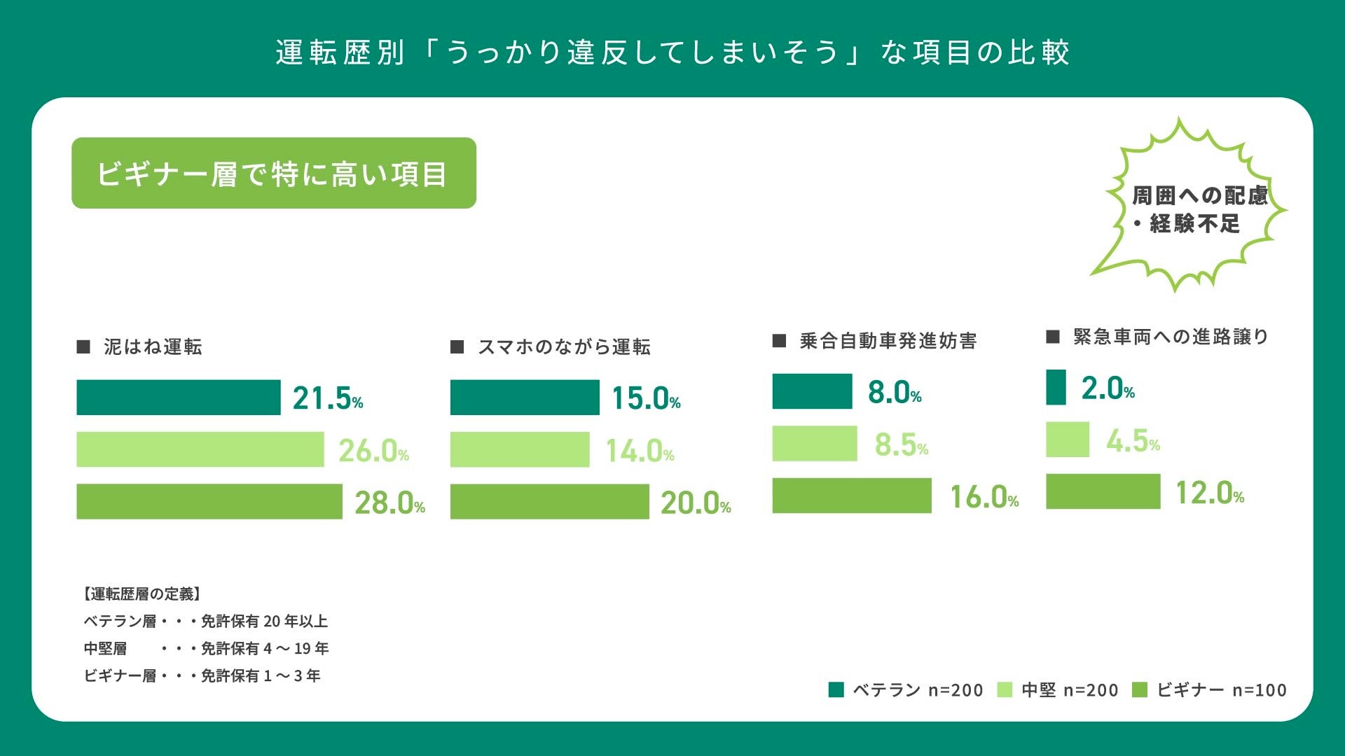 ●なお、「乗合自動車(バス等)発進妨害」や「緊急車両への進路譲り」についても、ビギナー層での「うっかり違反」リスクが高いことがわかりました。これらはビギナー層の周囲への配慮・経験不足が影響していると考えられます。