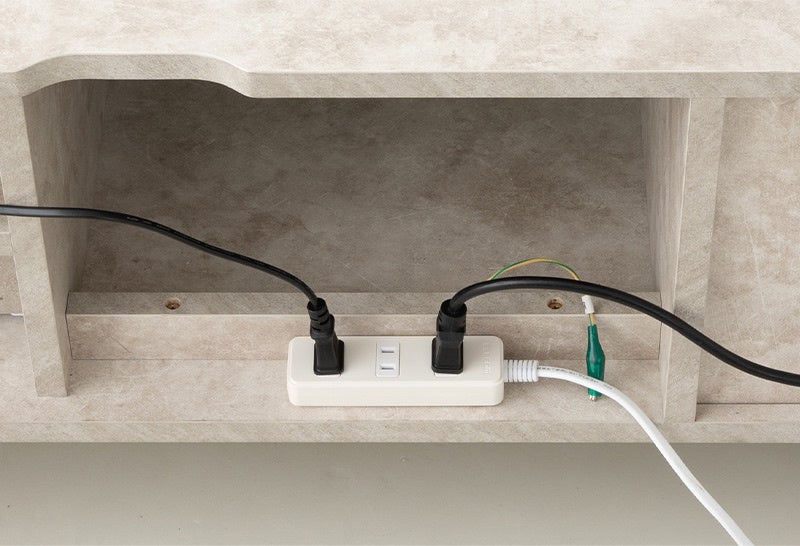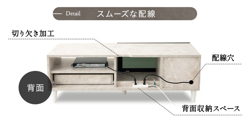 置き場に困るコンセントタップを収納できるスペースを背面に確保。テレビボード下の掃除もしやすくなります。