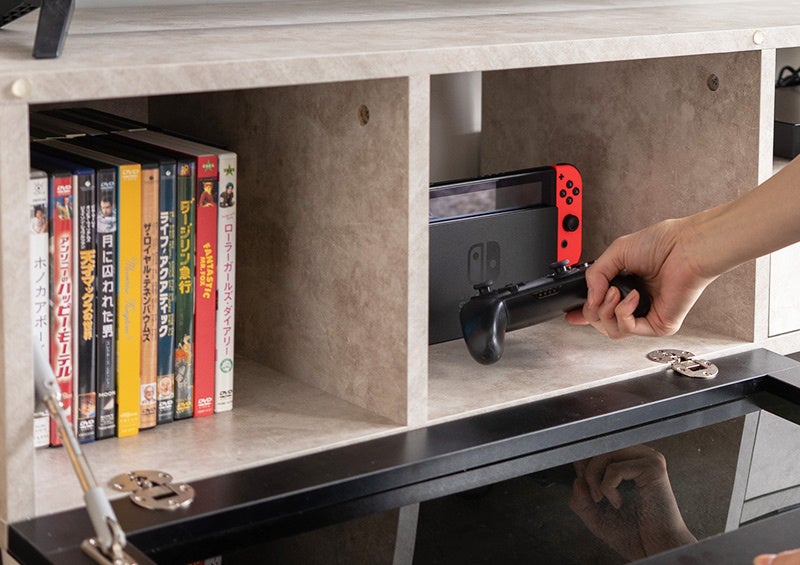 フラップ扉内は2室に分かれており、左側には本やBlu-rayを、背面吹き抜けタイプの右側には、熱を発しやすい無線ルーターや小型のゲーム機なども収納できます。