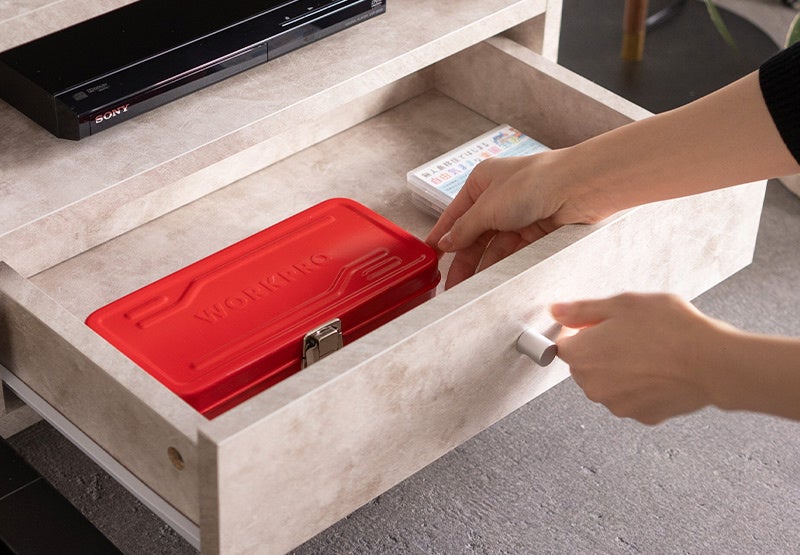 リビングで散らかりがちな小物を収納できる引き出しは、スライドレール式でスムーズな開閉が可能。
