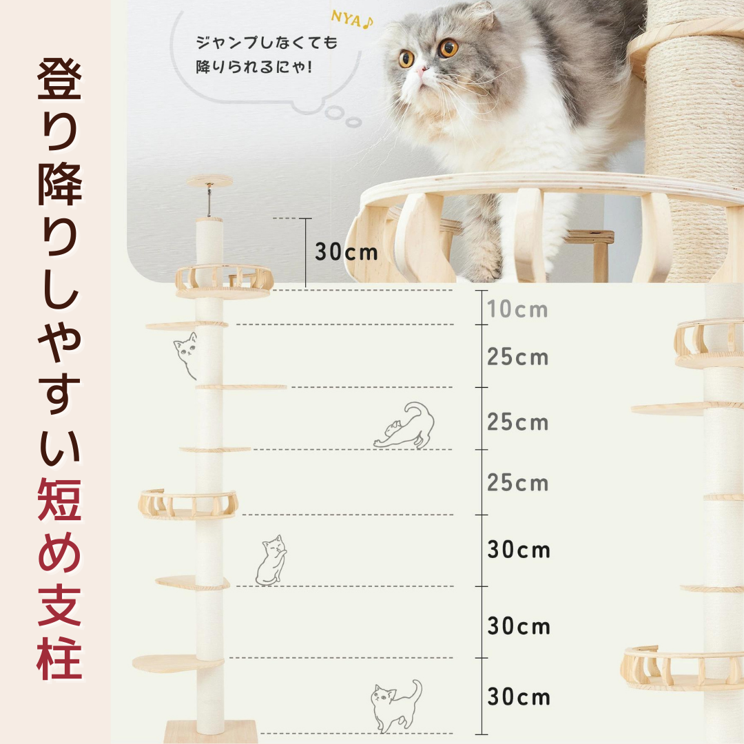 SUMIKAの突っ張り型木製キャットタワー『キミの木シリーズ』は、賃貸住宅でも無理なくご利用いただけるスリムな突っ張り型でありながら、12cmの太い支柱を使用することで安定感をUP。登り降りのしやすさを考え支柱間隔は約42cmに設計されていましたが、短足猫さんのご家族からは「短足種なので降りるときが不安そうです」「運動が苦手で、落ちないか心配…」というお声も届いておりました。