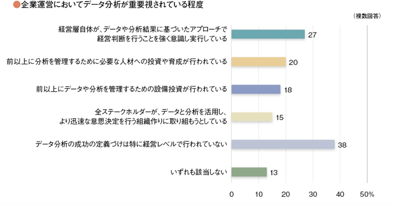 企業全体におけるデータ分析への取り組み状況として、 データの分析や活用に取り組んでいると答えたのは回答者の約50%でした。 また、 回答者の27%が「経営層自体が、データや分析結果に基づいたアプローチで経営判断を行うこと(データドリブン経営)を強く意識して実行している」と答えました。