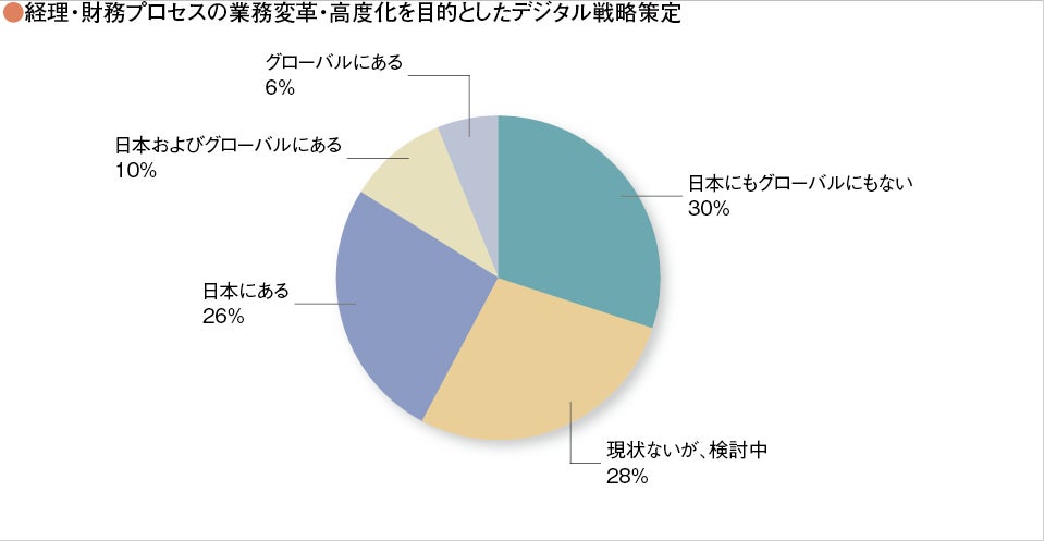 また、 「経理・財務プロセスにおいて業務変革・高度化を目指したデジタル戦略は策定されているか」という質問に対しては、 グローバル拠点か日本拠点かを問わず「デジタル戦略が存在する」と回答した企業はおよそ40%、 「現状ないが検討中」がおよそ30%と、 合わせて70%程度の企業が経理・財務プロセスのデジタル戦略を進めていることが分かりました。