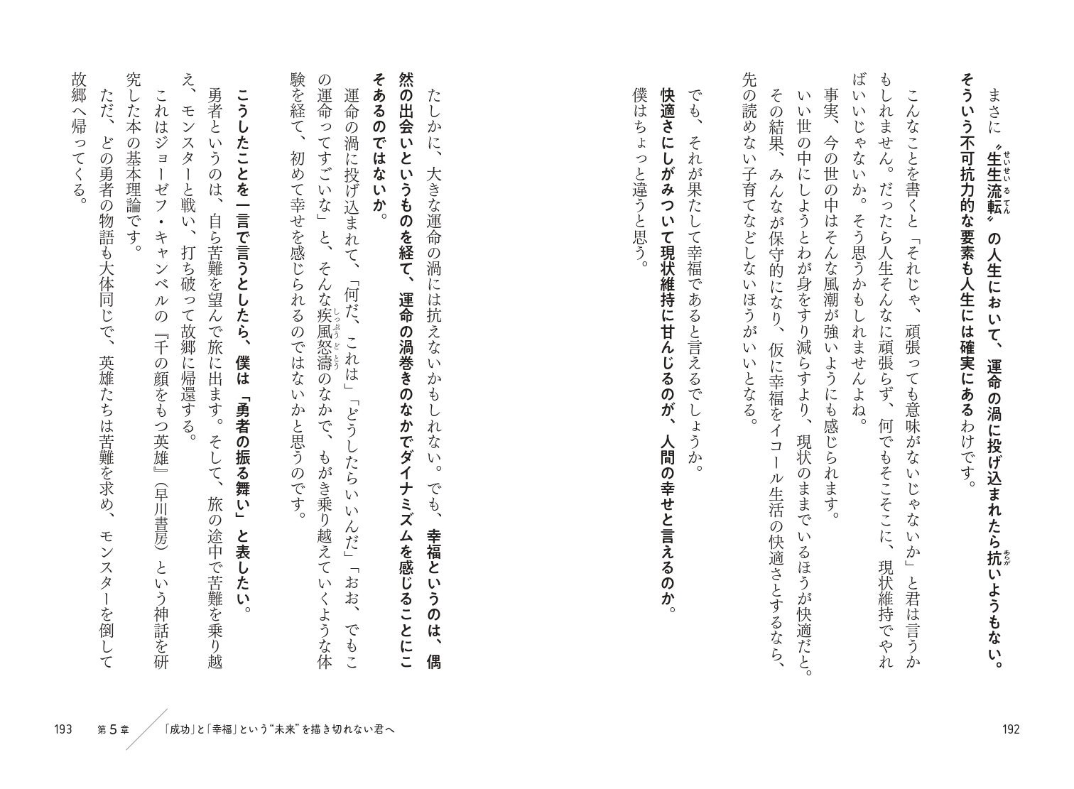 これは本書に登場するメッセージの一例です。これらはすべて齋藤先生が、これまで教え子たちだけに語ってきたこと。さらに教え子にも明かしてこなかった、26歳、収入ゼロの大学院生という立場で結婚を決意した理由、あるいは、研究者として第一歩を踏み出した当時の「傲慢」だった自身の立ち振る舞い、そして数々の教え子たちの経験談といった、若い人に刺さるエピソードばかり集めました。そうした内容のエッセンスを右ページに、その具体的な解説となる手紙文を次ページ以降に配しているので、1エピソード基本6~8ページと、とても読みやすい構成となっています。
