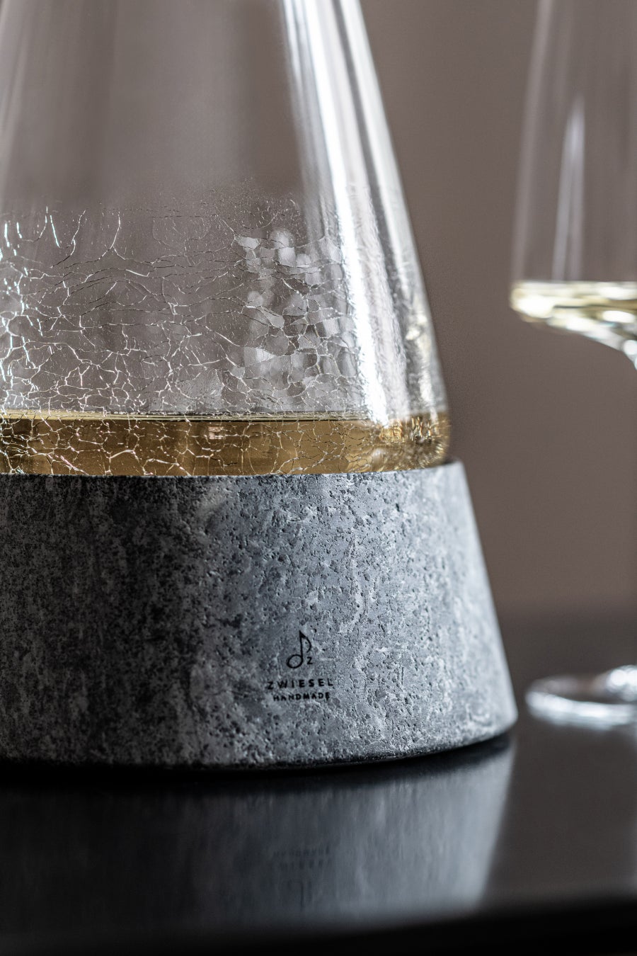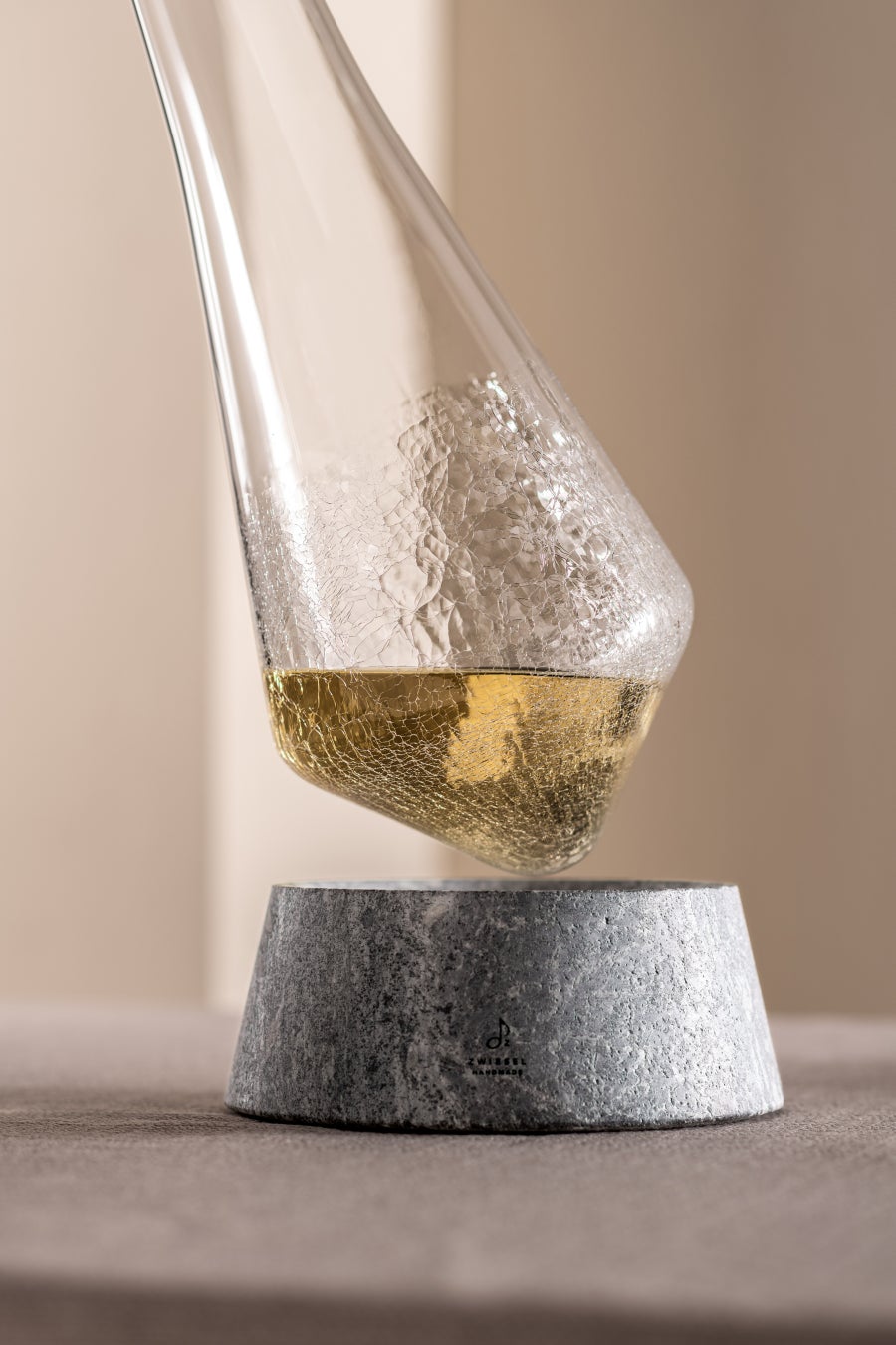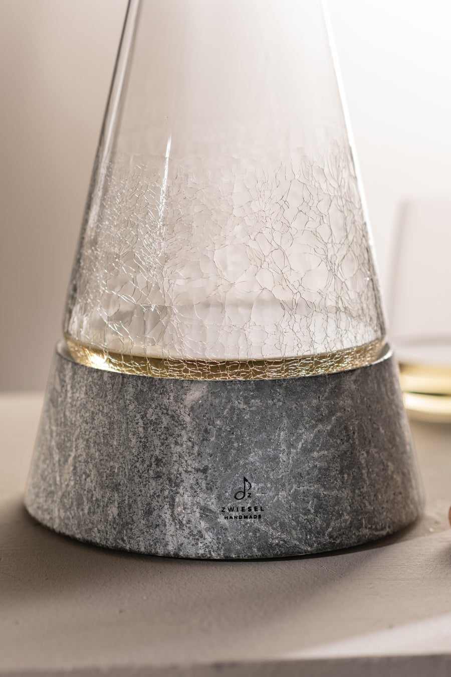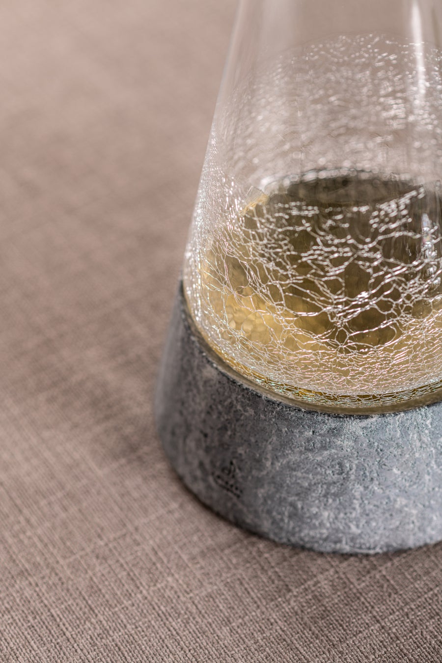 透明感あふれるクリスタルガラスと、自然な風合いを持つ無垢な石とのコントラストが視覚的な美しさを際立たせます。デカンタ下部には、繊細な「クラックル(ひび割れ模様)」が施され、儚くも美しい存在感を演出します。