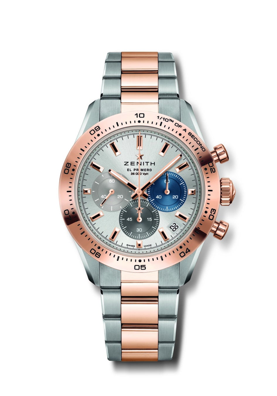フルゴールドのクロノグラフは、エル・プリメロよりも更に前からゼニスの歴史の中で特別な位置を占めています。高い性能と貴重であることは相互排他的である必要はなく、ゼニスはその両方を兼ね備えるモデルとして、クロノマスター スポーツをすべてローズゴールドで作り上げました。これには、ブレスレットと1/10秒表示を備えた刻印入りベゼルも含まれます。ゴールドの針とアプライドインデックスを備えたエル・プリメロのシグネチャーである3色のカウンターが配されたブラックまたはホワイトの文字盤をお選びいただけるローズゴールド製クロノマスター スポーツは、ゴールドの温かみのある輝きを引き出すために、表面にサテンおよびポリッシュ仕上げが細心の注意を払って施されています。