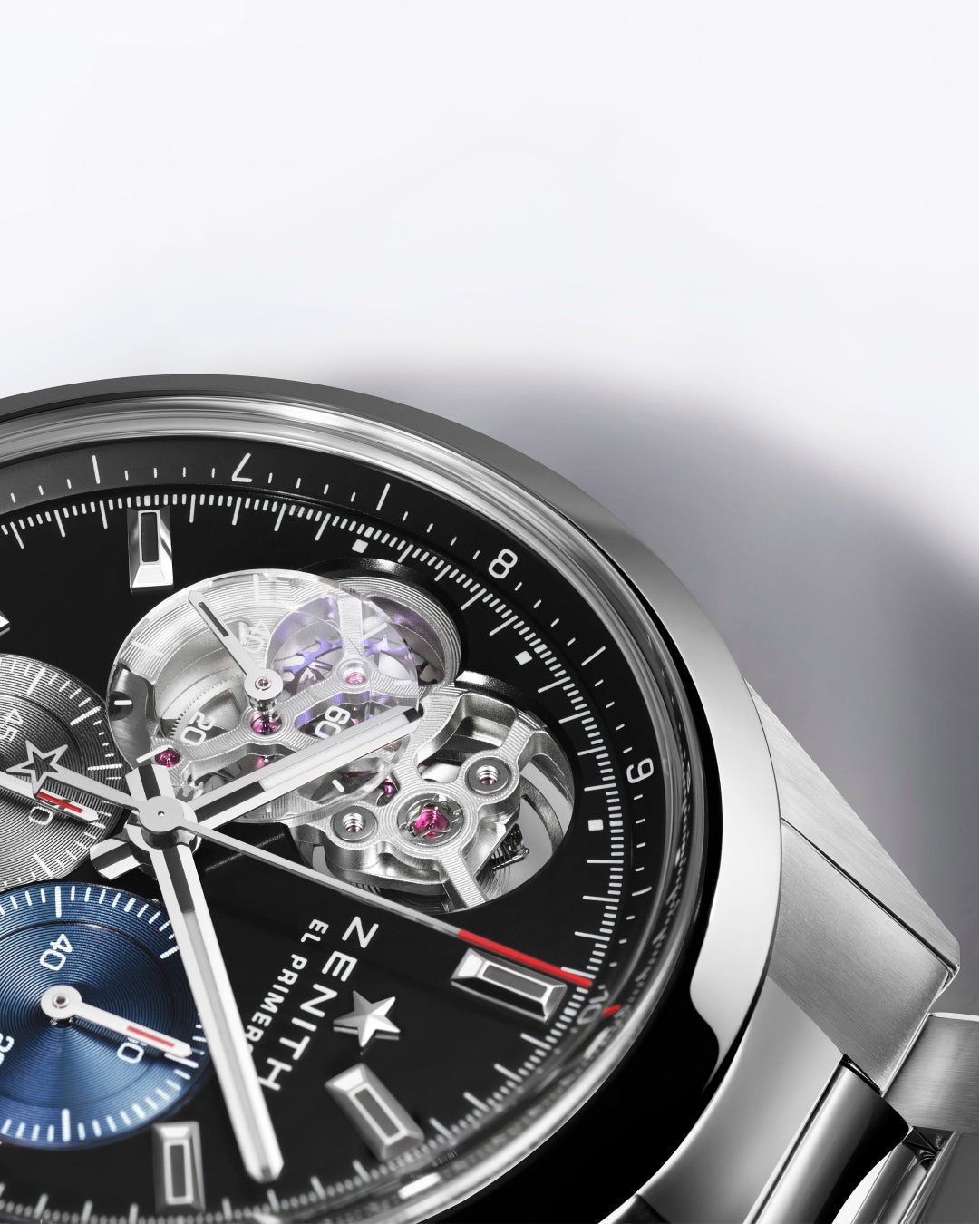 クロノマスター オープンの最新モデルは、1969年に発表されたアイコニックなA386の、ひと目でエル・プリメロと分かる3色文字盤のデザインを受け継ぎながら、スケルトンの透明感を表現しています。過去モデルでは、9時位置のスモールセコンドカウンター全体をカットアウトしていたのに対し、新モデルでは3色カウンターにヘサライトクリスタル製のエレメントを使用。サブダイヤルの視認性を確保しながら、星形のシリコン製ガンギ車を見ることができます。また、前モデルでは「フレーム」を取り付け、丸い開口部に面取りを施していたのに対し、開口部そのものにも改良を加え、より直線的なブリッジとコンテンポラリーなグレートーンのムーブメントを眺めることができるようになりました。