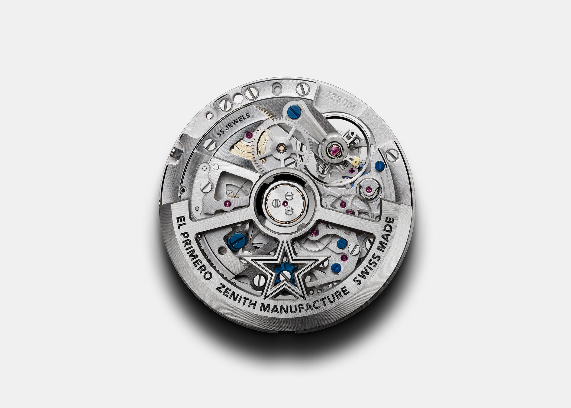 世界初の高振動自動巻きクロノグラフ キャリバーであるエル・プリメロを50年以上追及し続けた結果として、クロノマスター スポーツ シリーズには、由緒あるムーブメントの最新バージョンであるエル・プリメロ 3600が搭載されています。5Hz(毎時36,000振動)という高精度のムーブメントによって、1/10秒単位を精確に計測し、ベゼルと文字盤上で読みやすく表示します。持続時間にも改良が施され、60時間のパワーリザーブを実現しました。サファイアガラスのシースルー仕様になっているケースの裏蓋からは、ブルーのコラムホイールや、ゼニススターがあしらわれたオープンローターなど、新しい構造をはっきりと見ることができます。