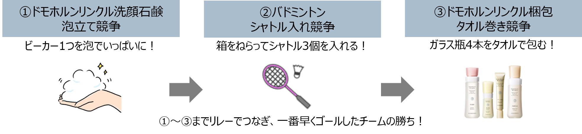 | <オリエンテーション> ・社長挨拶(歓迎の言葉) ・研修スタッフ紹介・挨拶 ・新人研修についての説明等 <レクリエーション:チーム対抗競技> ・ドモホルンリンクル洗顔石鹸 泡立て競争 ・バドミントン シャトル入れ競争 ・ドモホルンリンクル タオル巻き競争 <閉会式> ・表彰式 ・新入生代表挨拶 ・記念撮影 |